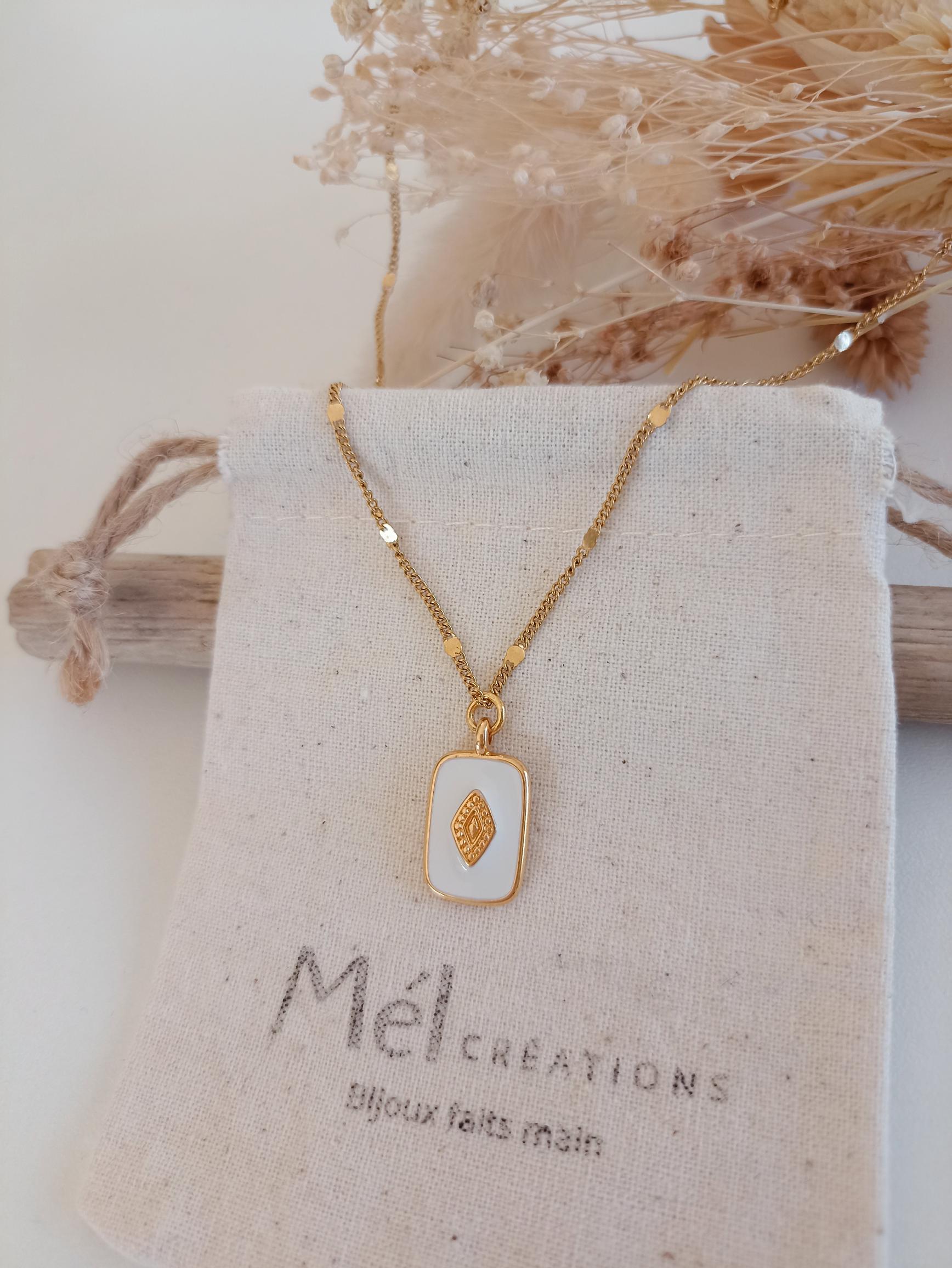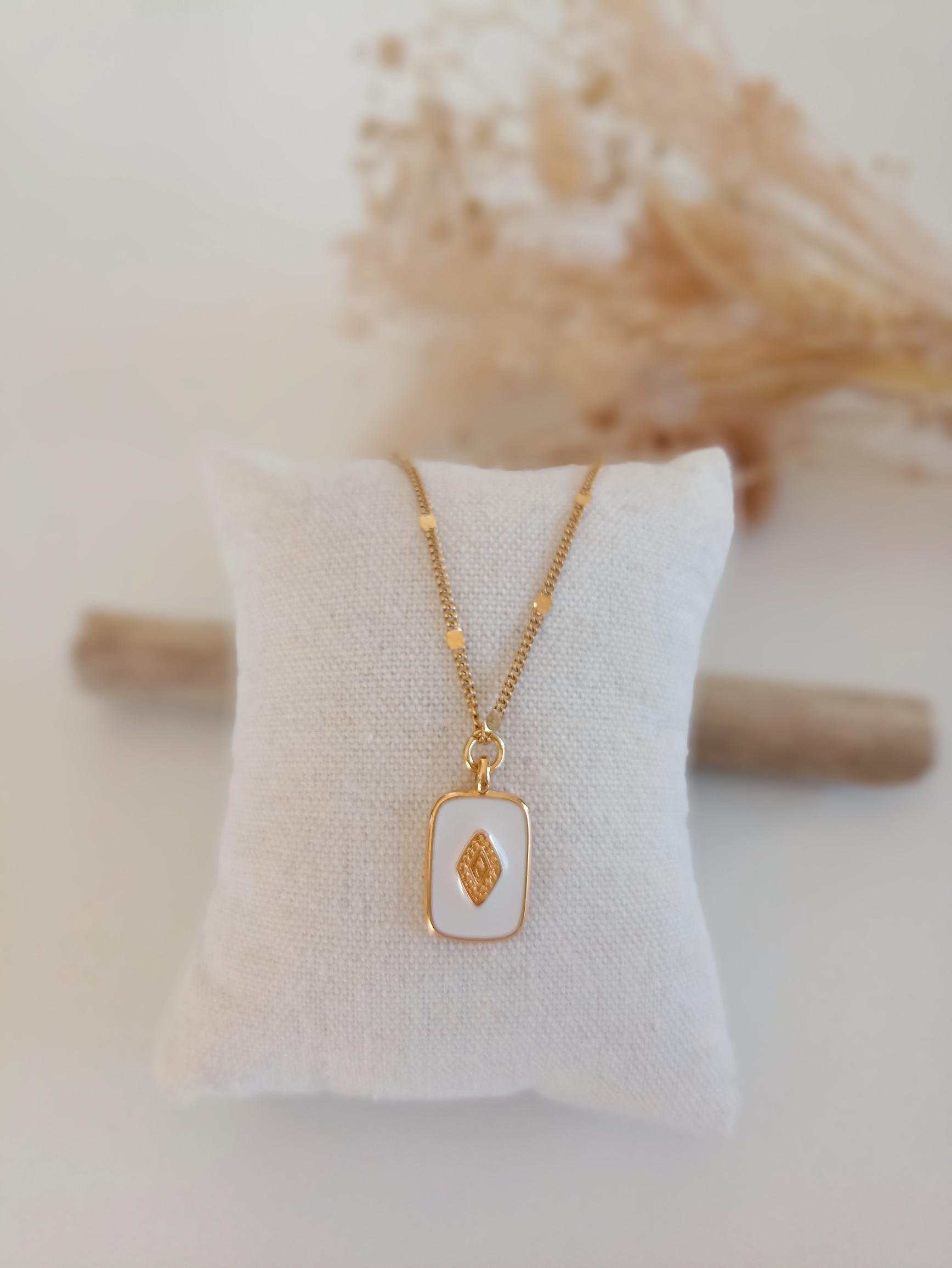 Lumineux et raffiné, ce collier met en valeur un pendentif rectangulaire orné d’un délicat motif doré sur fond blanc.