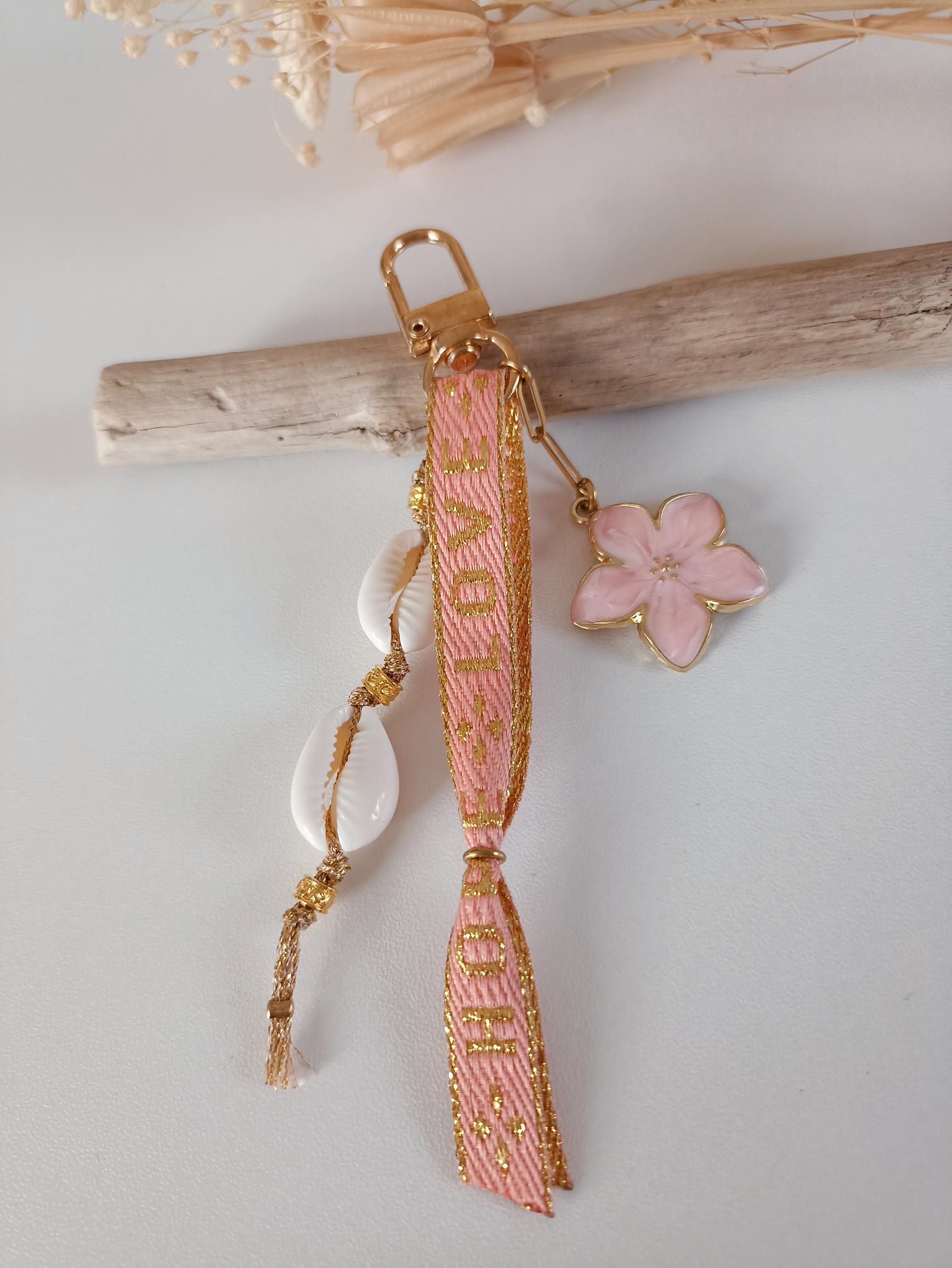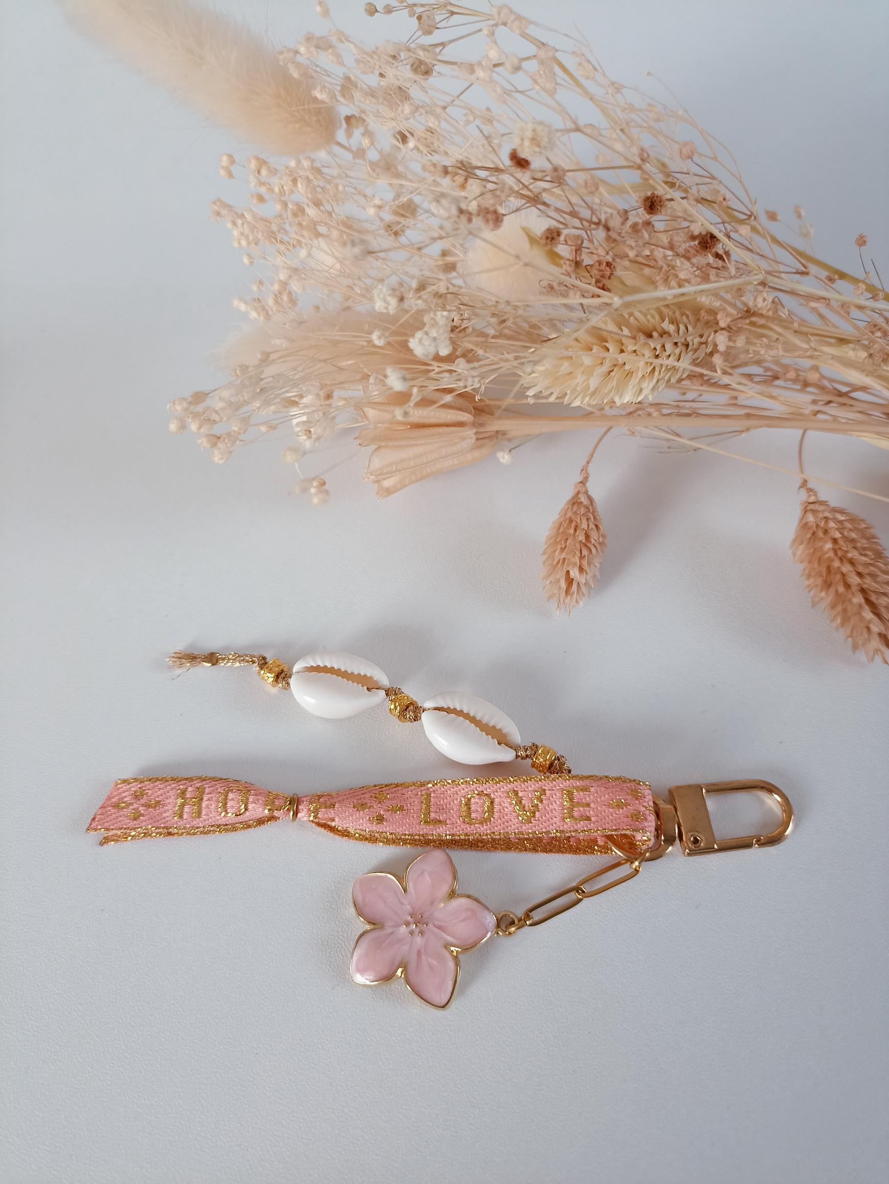 Élégant et symbolique, ce porte-clés à trois branches associe un ruban orange imprimé Love – Hope – Faith*, deux coquillages délicatement montés sur un fil doré, et une chaîne en acier inoxydable ornée d’une breloque fleur. Un accessoire unique parfait pour un trousseau ou un sac.