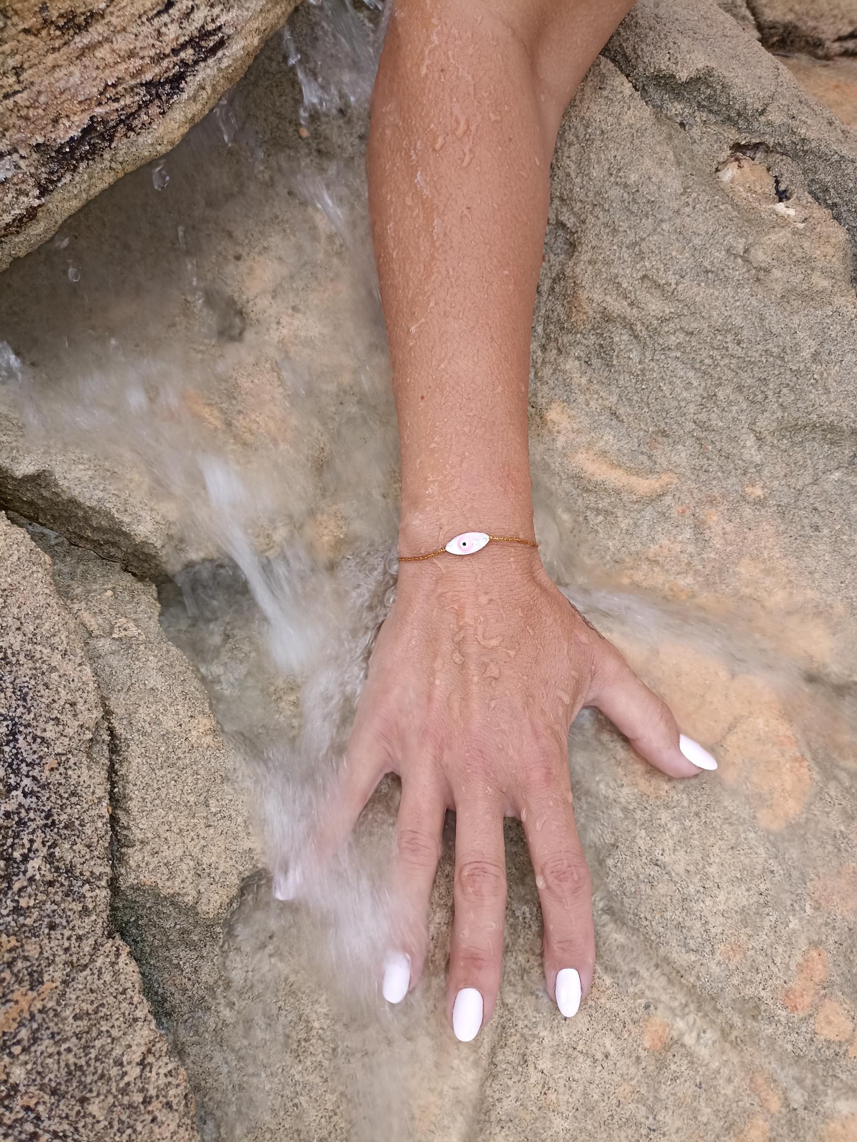 Matière : Fil polyester doré, perle stoppeuse en dorée à l'or fin 24K, perle en nacre