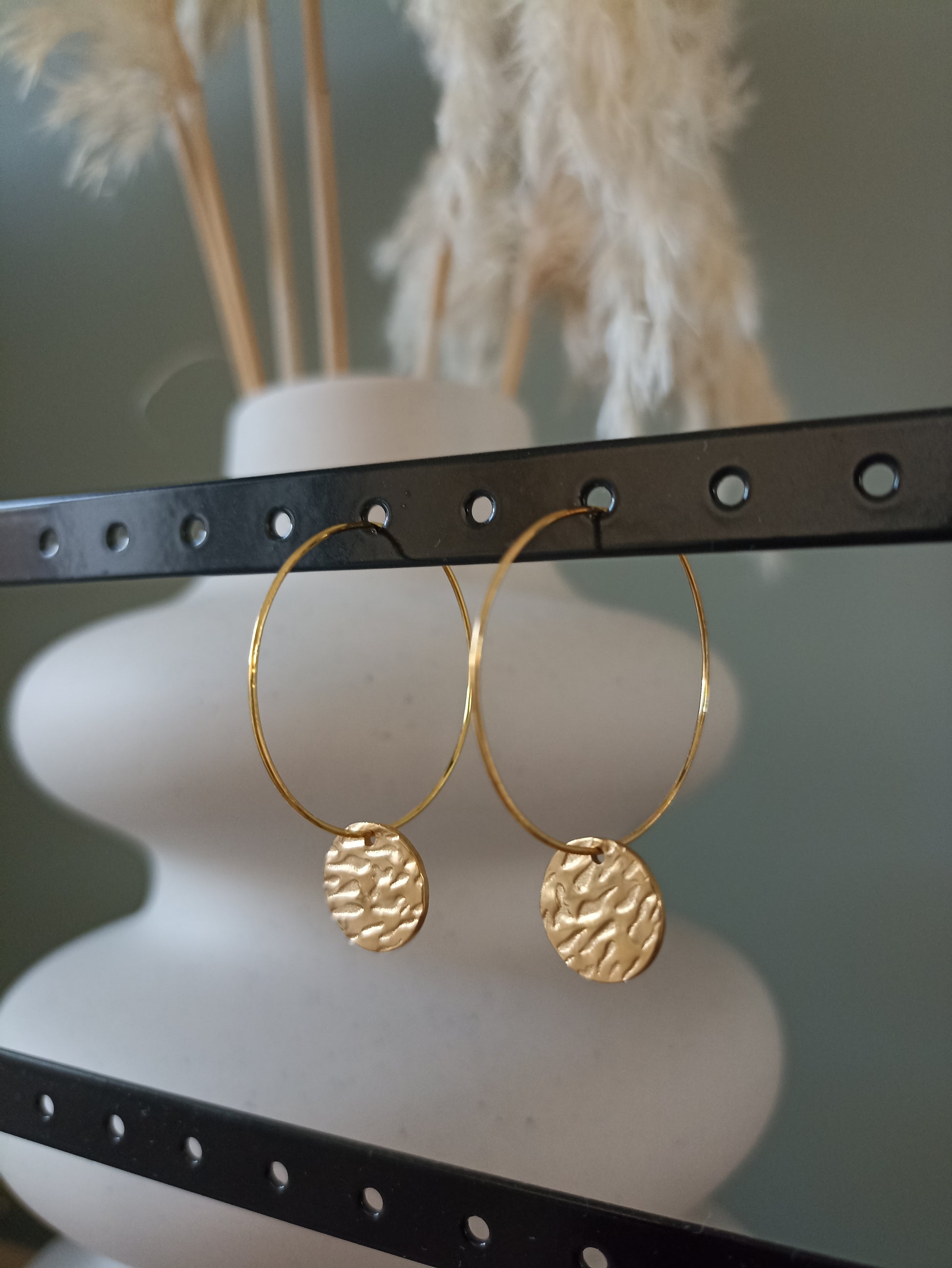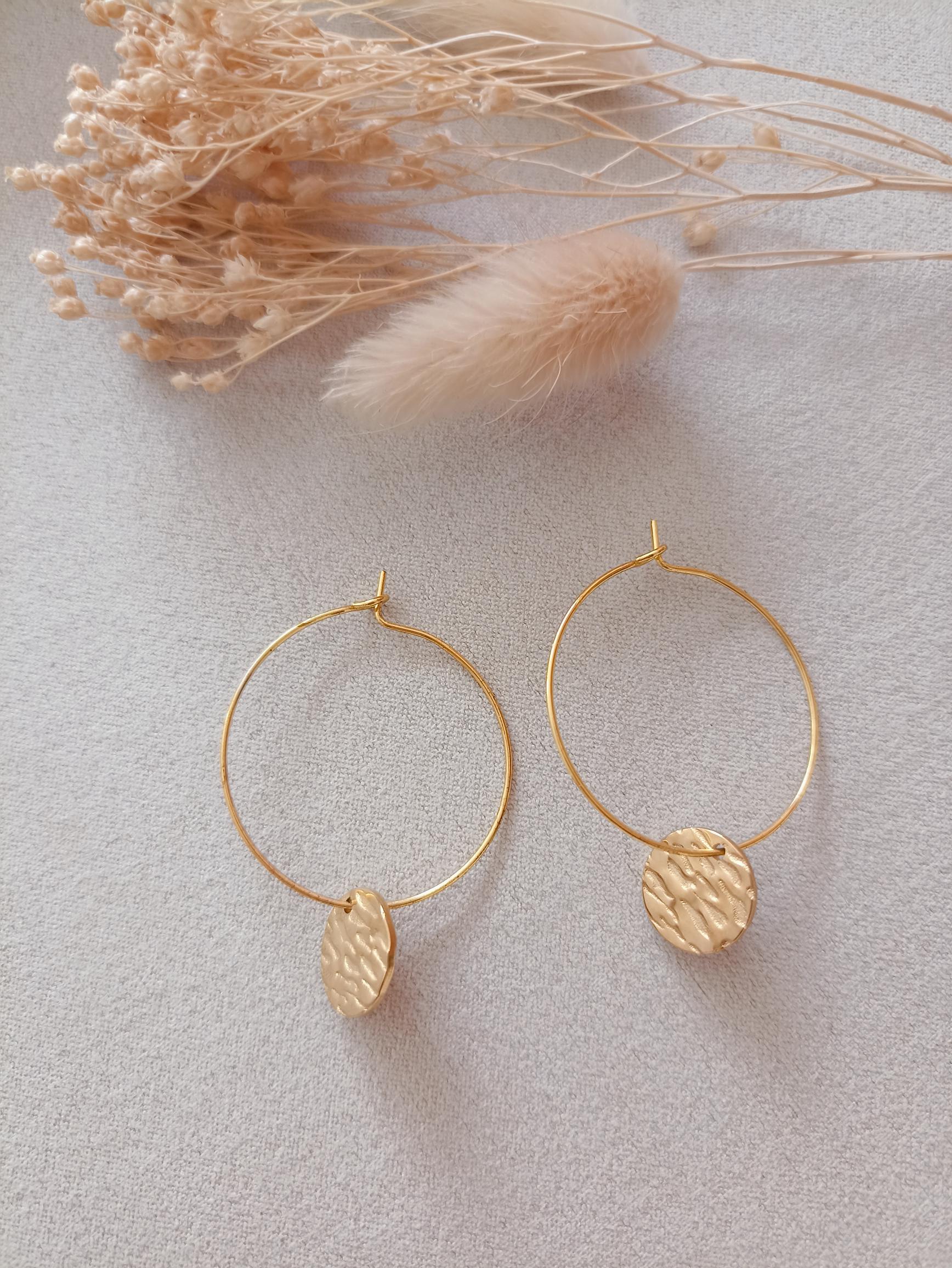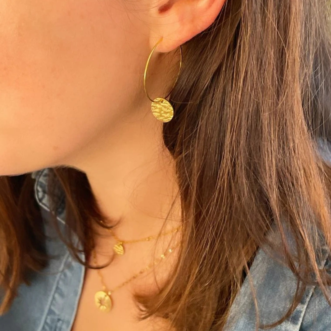 Paire de créole avec breloque martelée. Parfaites pour sublimer votre tenue