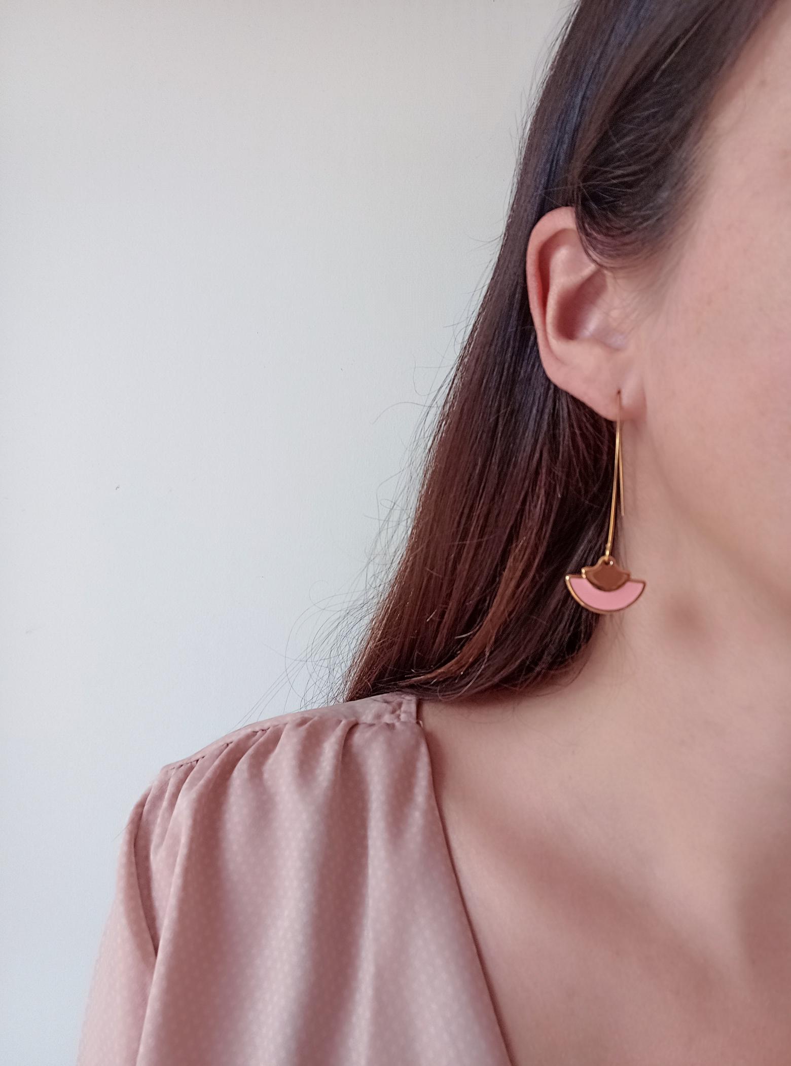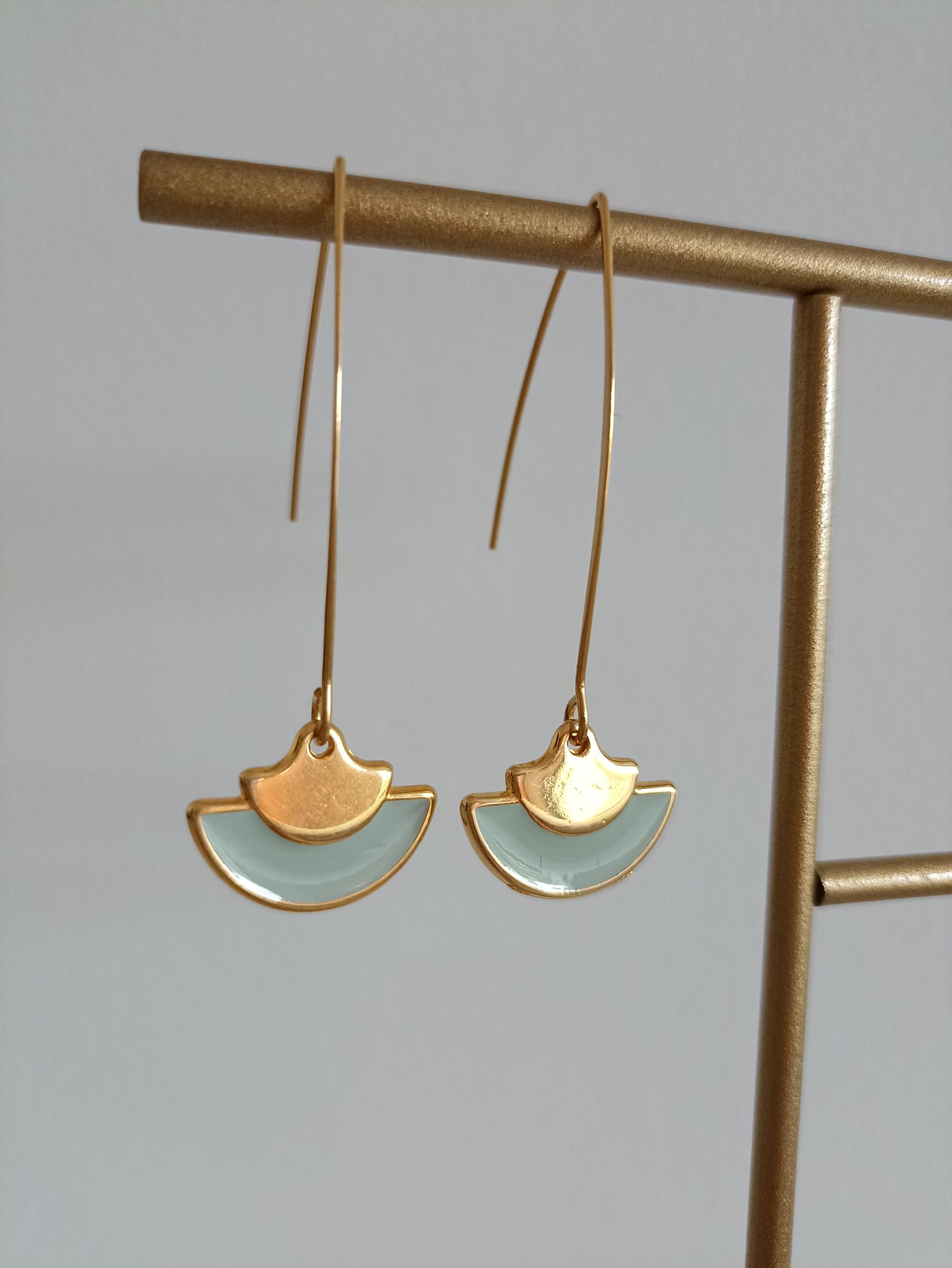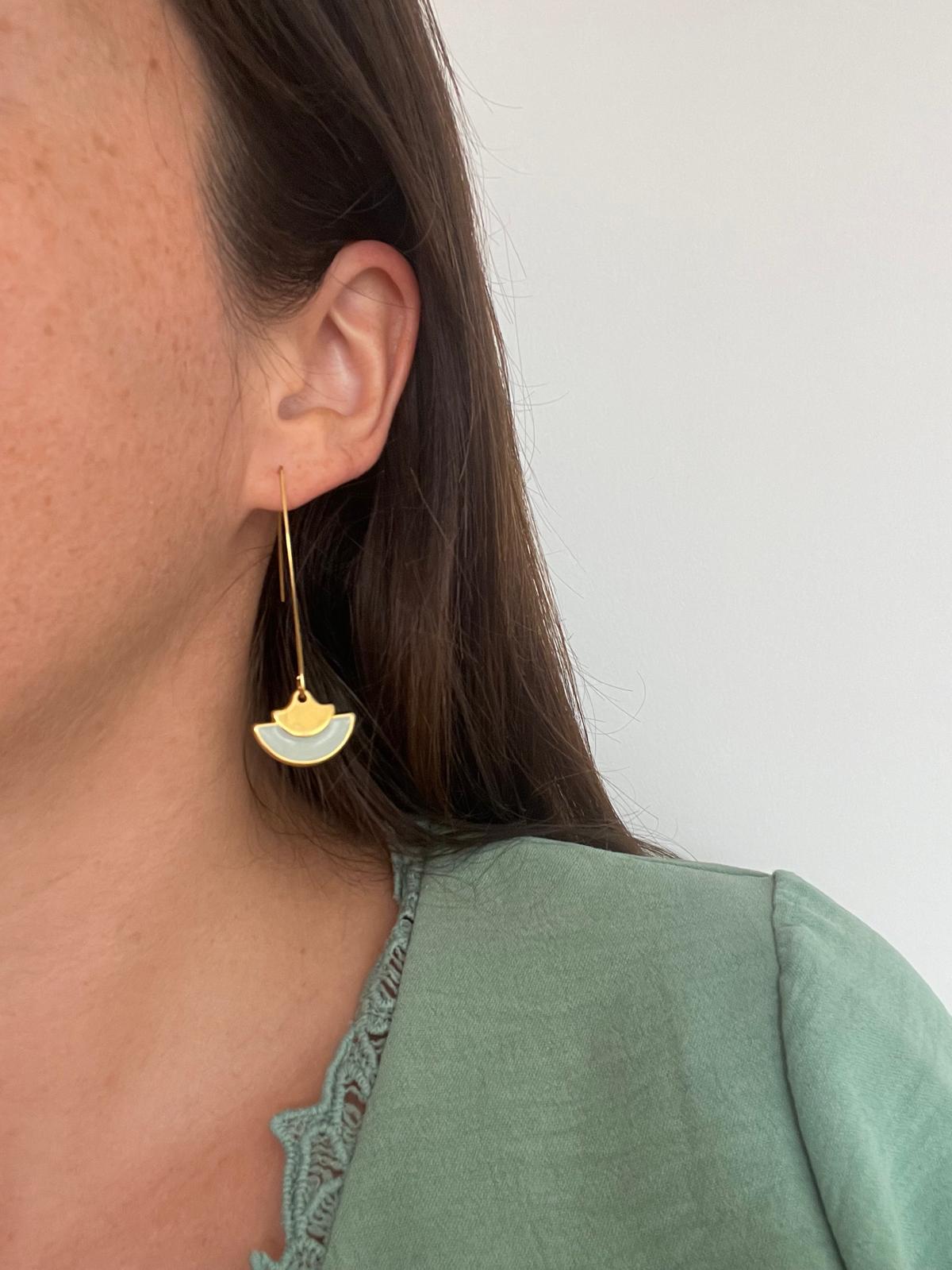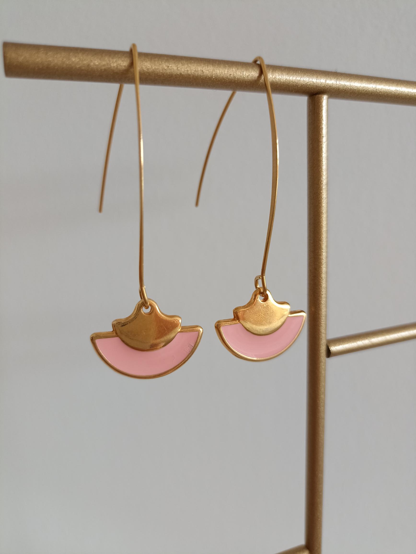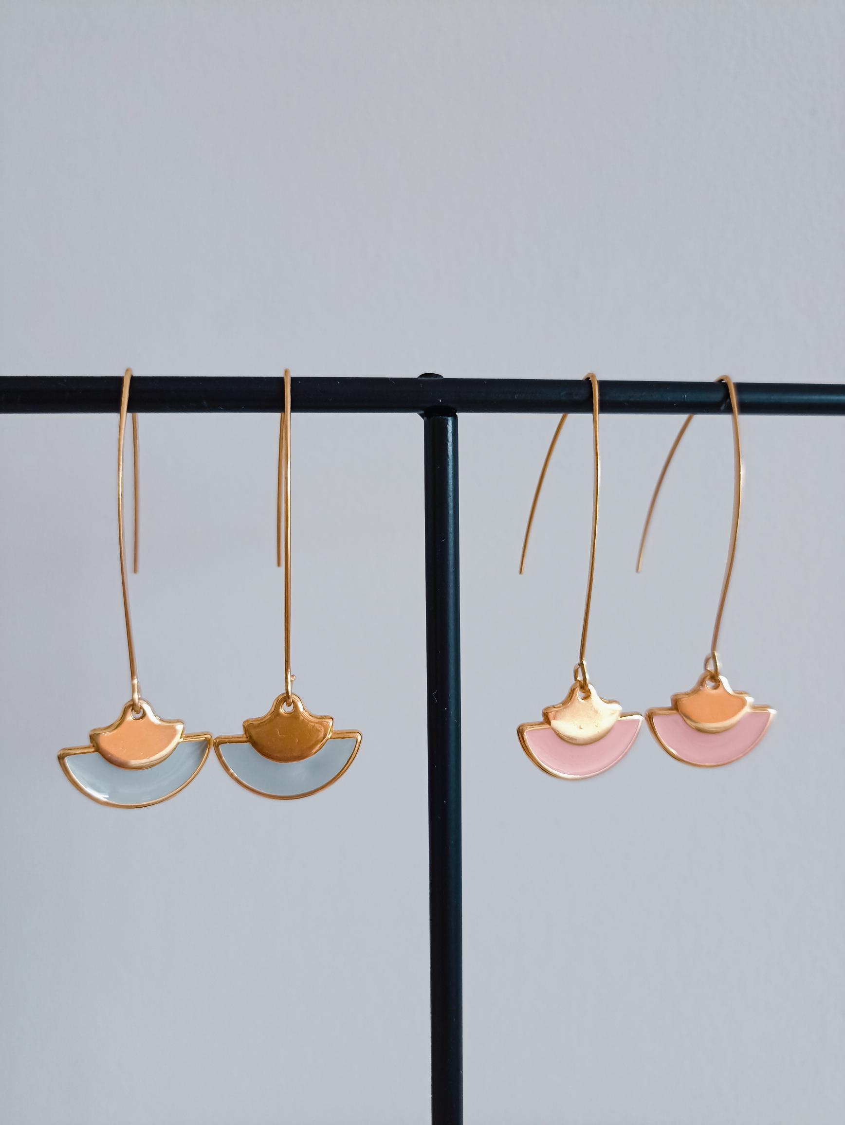Boucles pendantes élégantes avec un pendentif en forme d'éventail. Au centre, une touche de résine colorée en vert ou rose ajoute une note de charme.