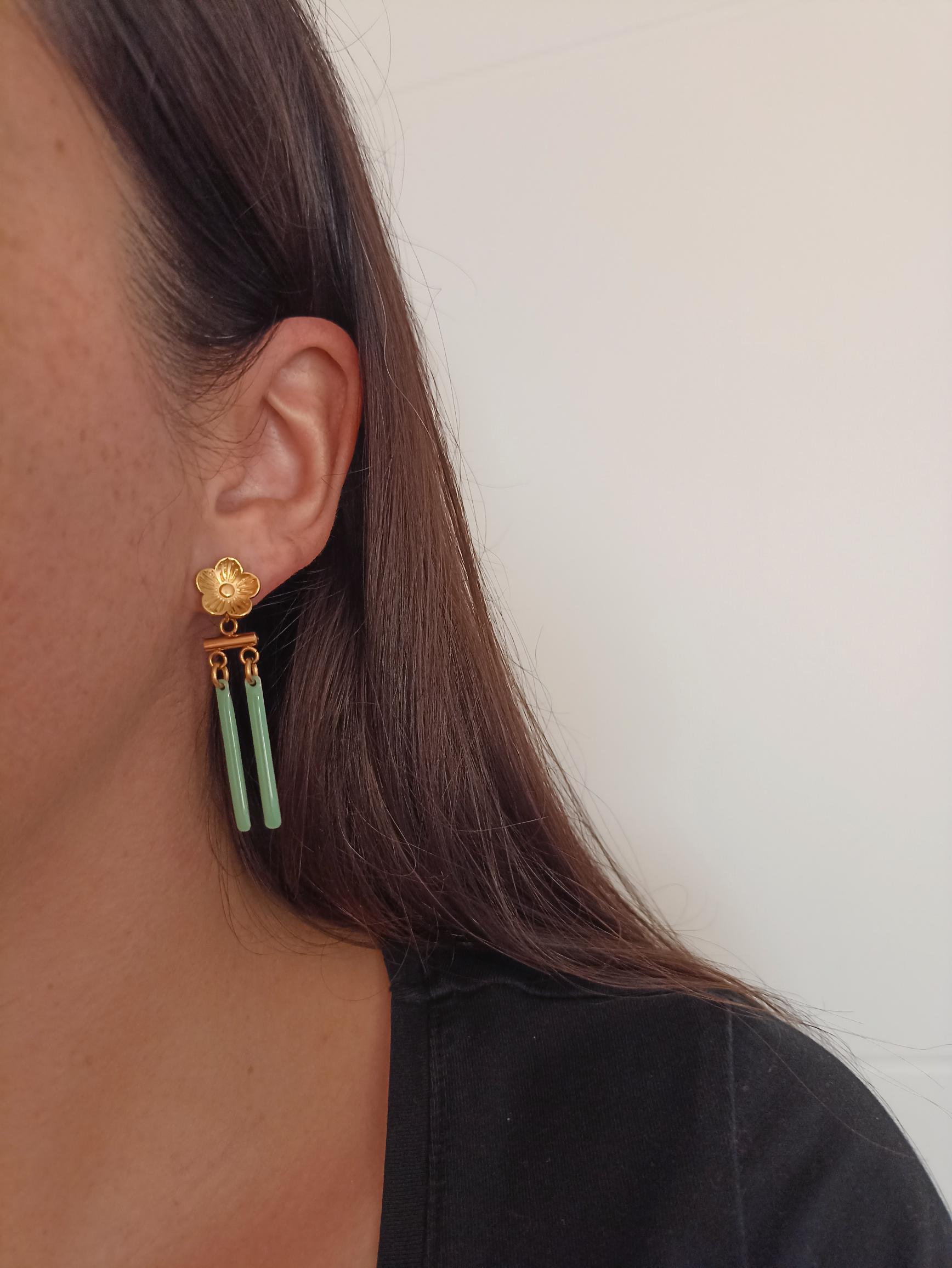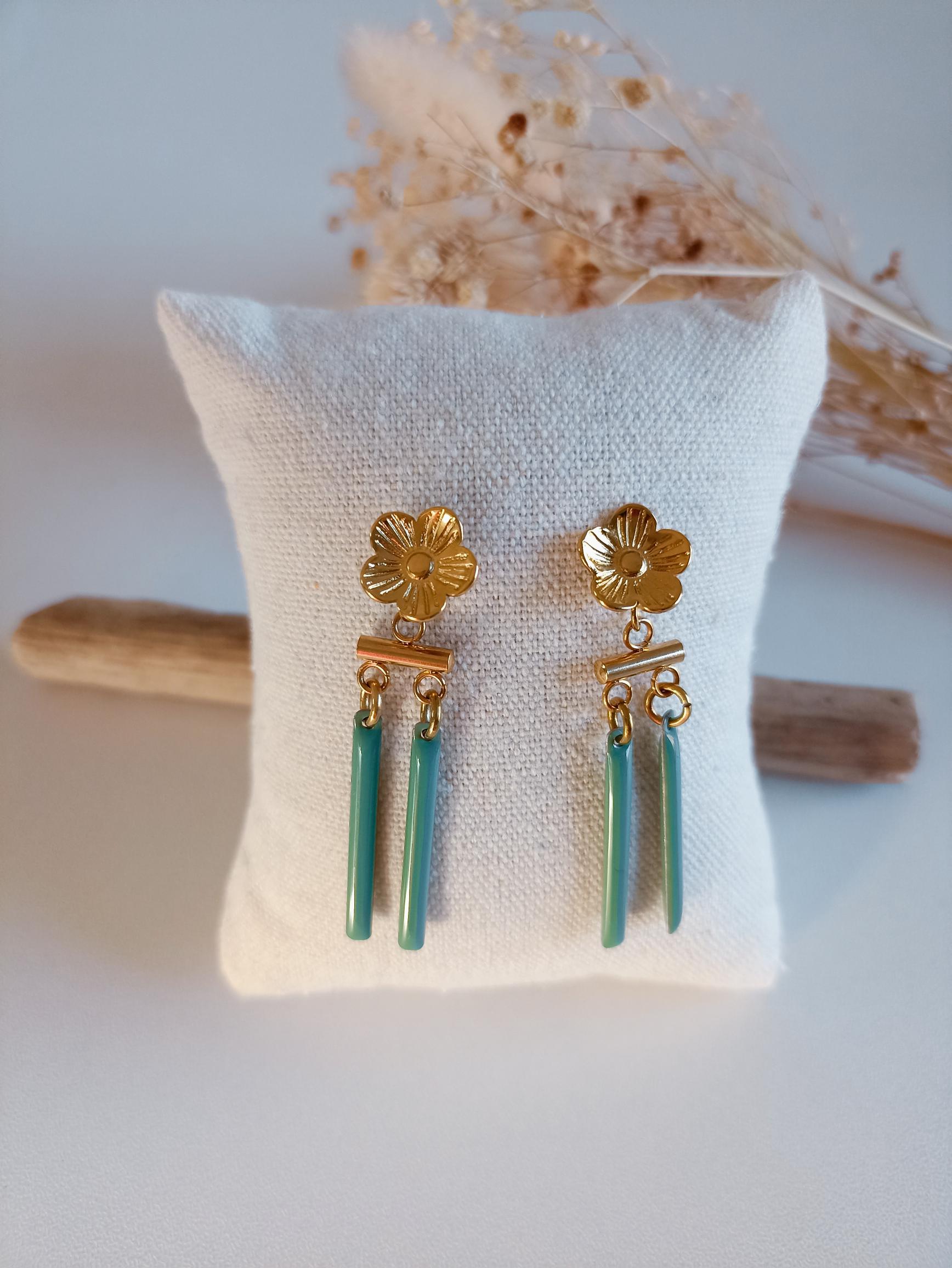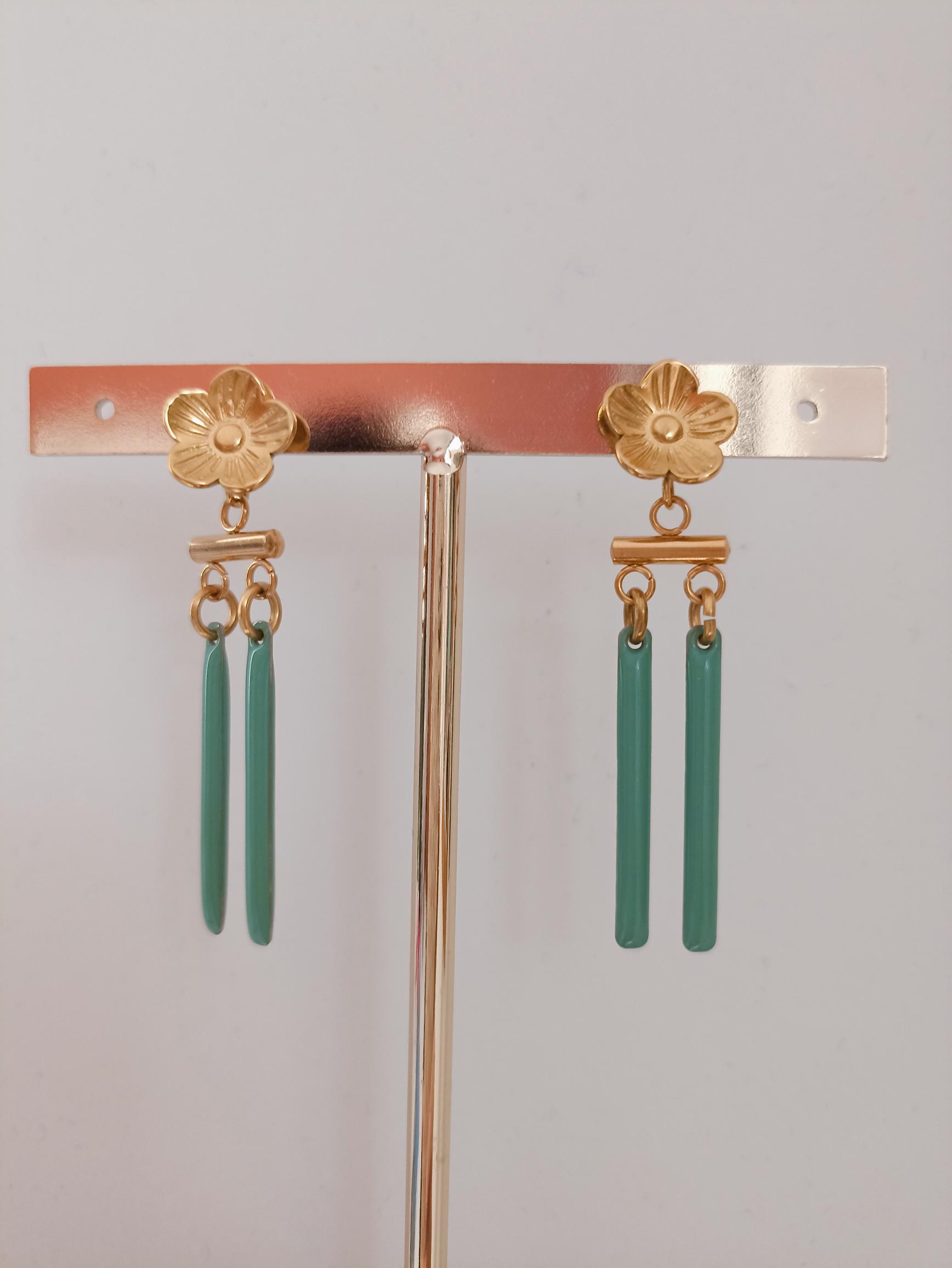 Boucles d’oreilles délicates avec leur clou en forme de fleur dorée et leurs sequins vert d’eau en résine époxy. L’association du doré et du vert apporte une touche fraîche et lumineuse, parfaite pour rehausser vos tenues avec élégance et douceur.