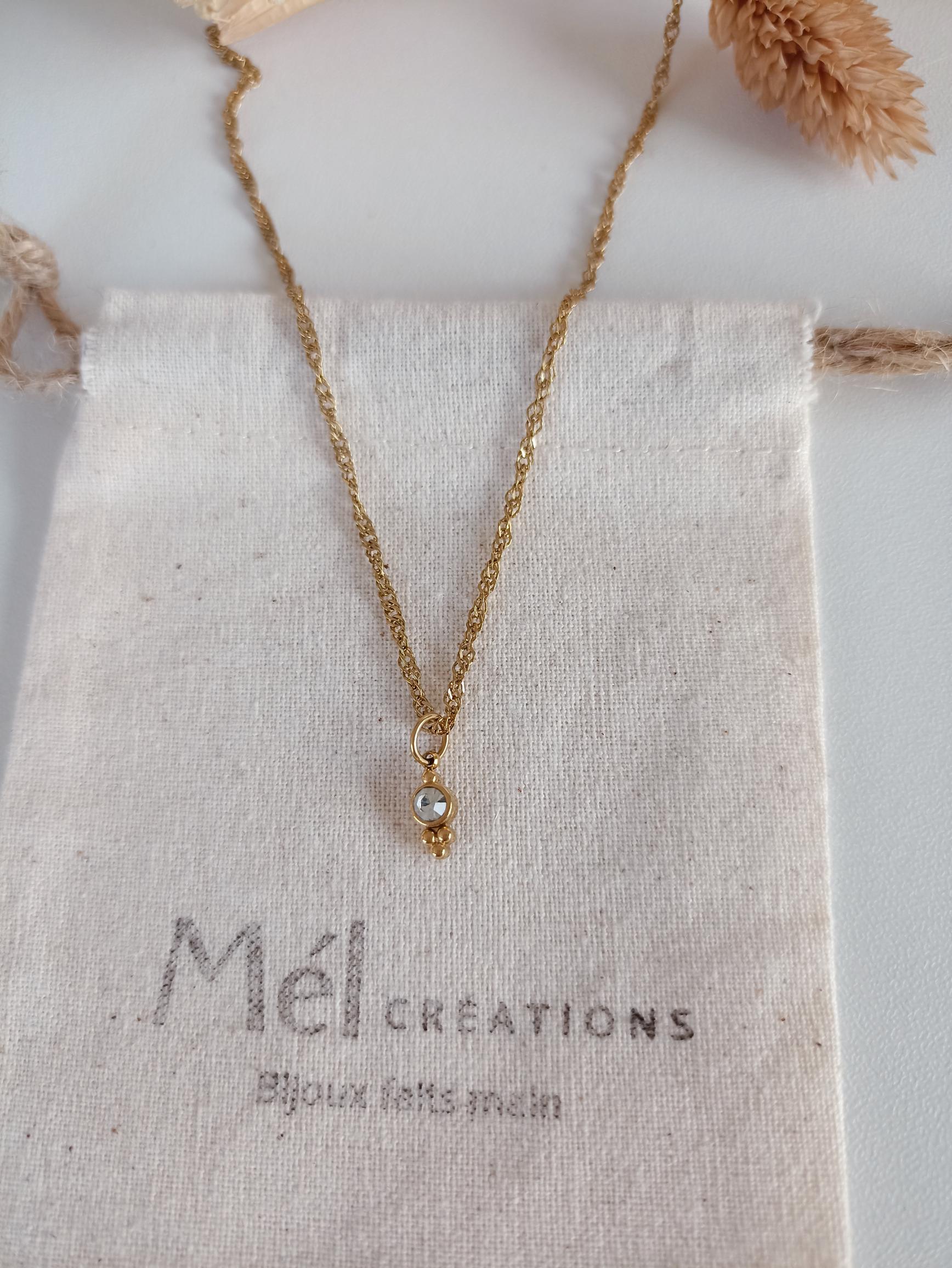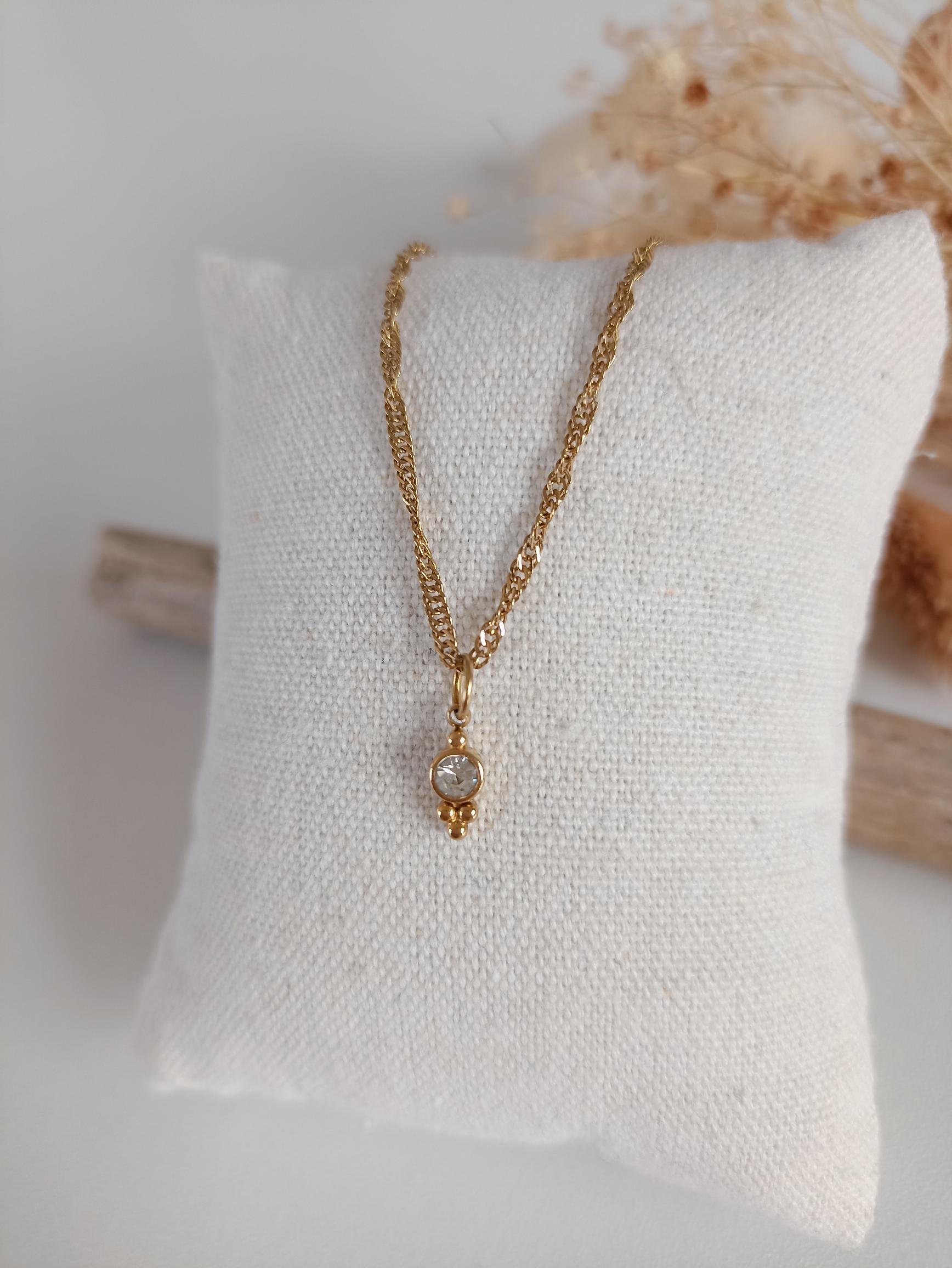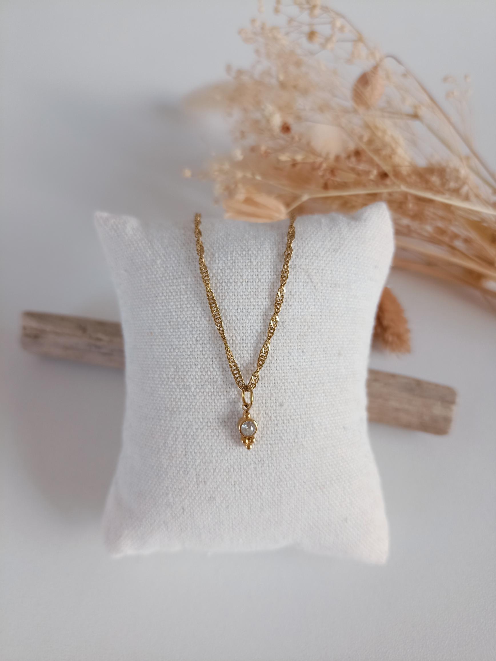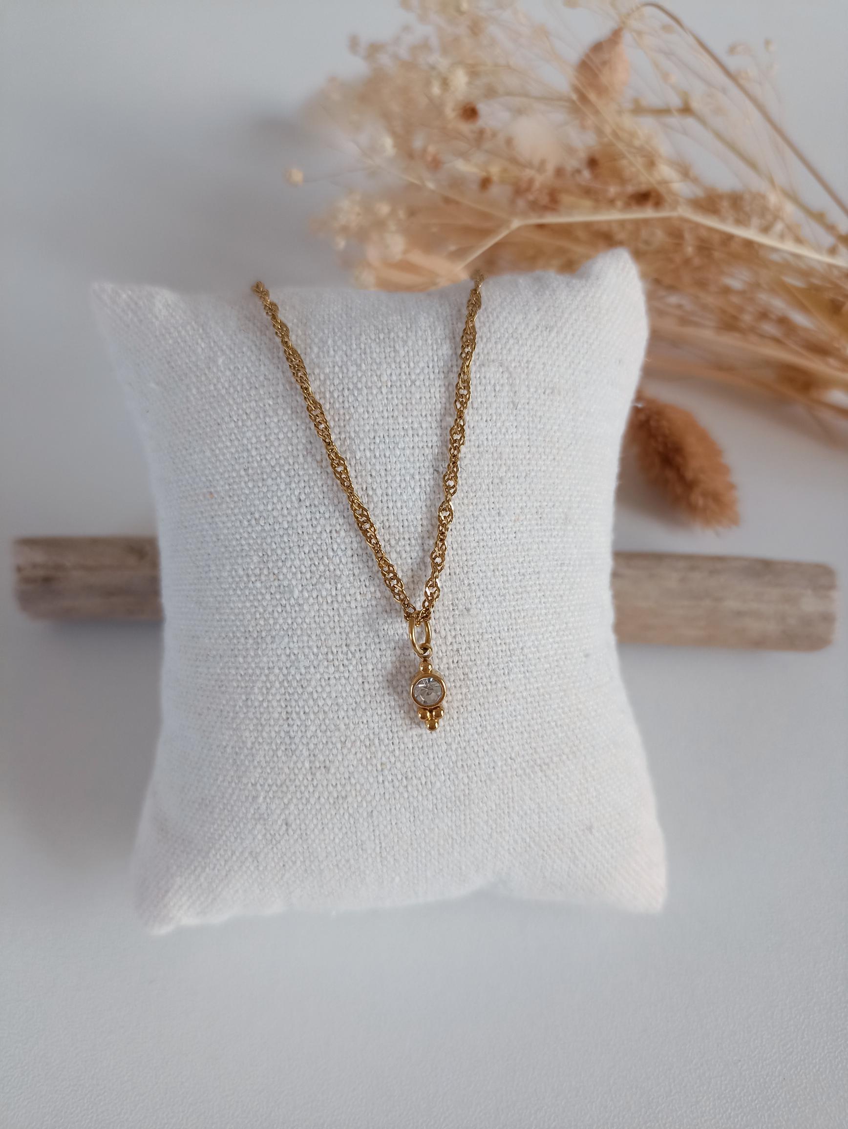 Ce collier fin et raffiné apporte une touche d’élégance discrète à toutes vos tenues. Composé d’une chaîne dorée délicatement travaillée, il est sublimé par un petit pendentif orné d’une pierre scintillante, sertie avec soin pour capter la lumière à chaque mouvement.