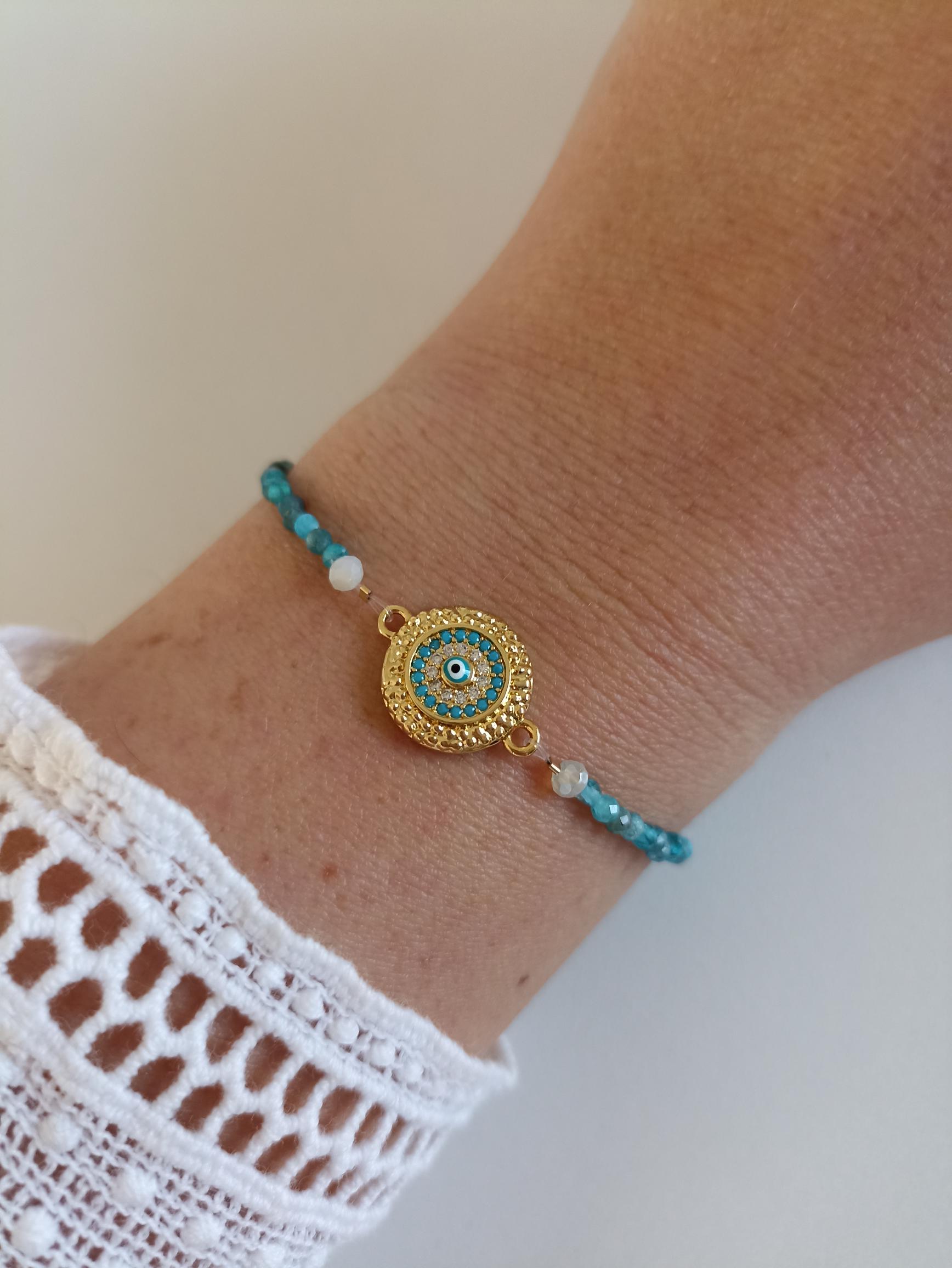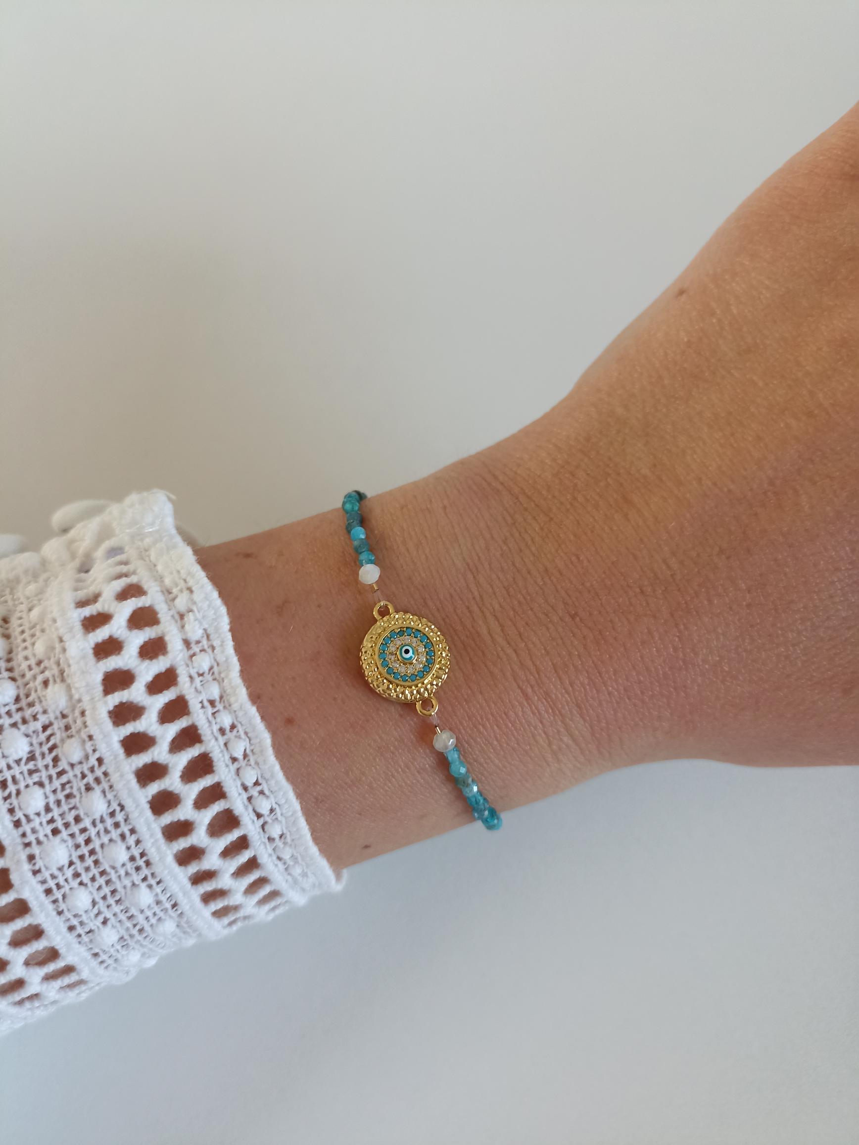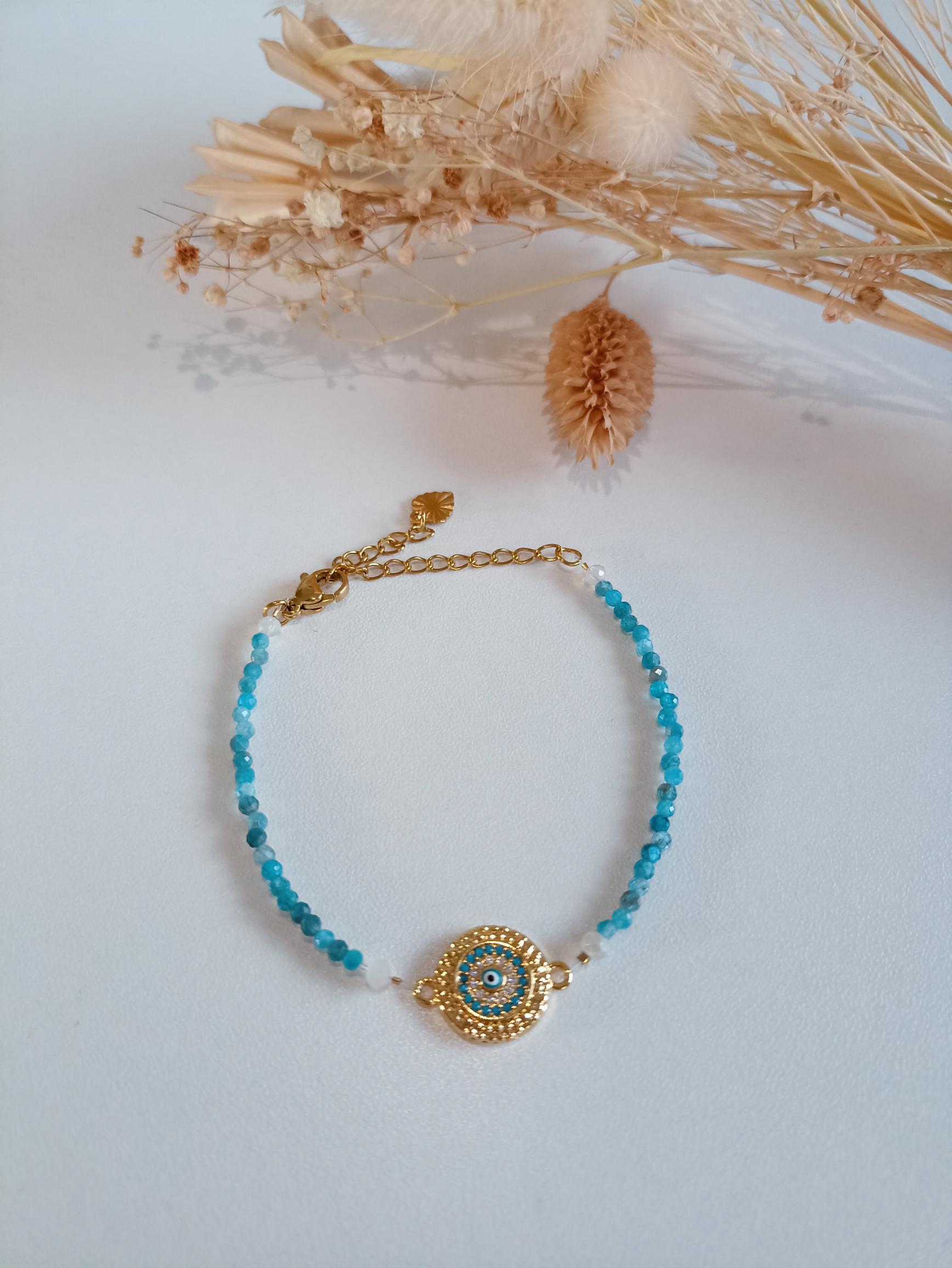 Raffiné et protecteur, ce bracelet se compose de perles gemmes bleu profond et d'une délicate breloque dorée ornée d’un œil symbolique. Un bijou à la fois intemporel et chargé de sens, à porter au quotidien