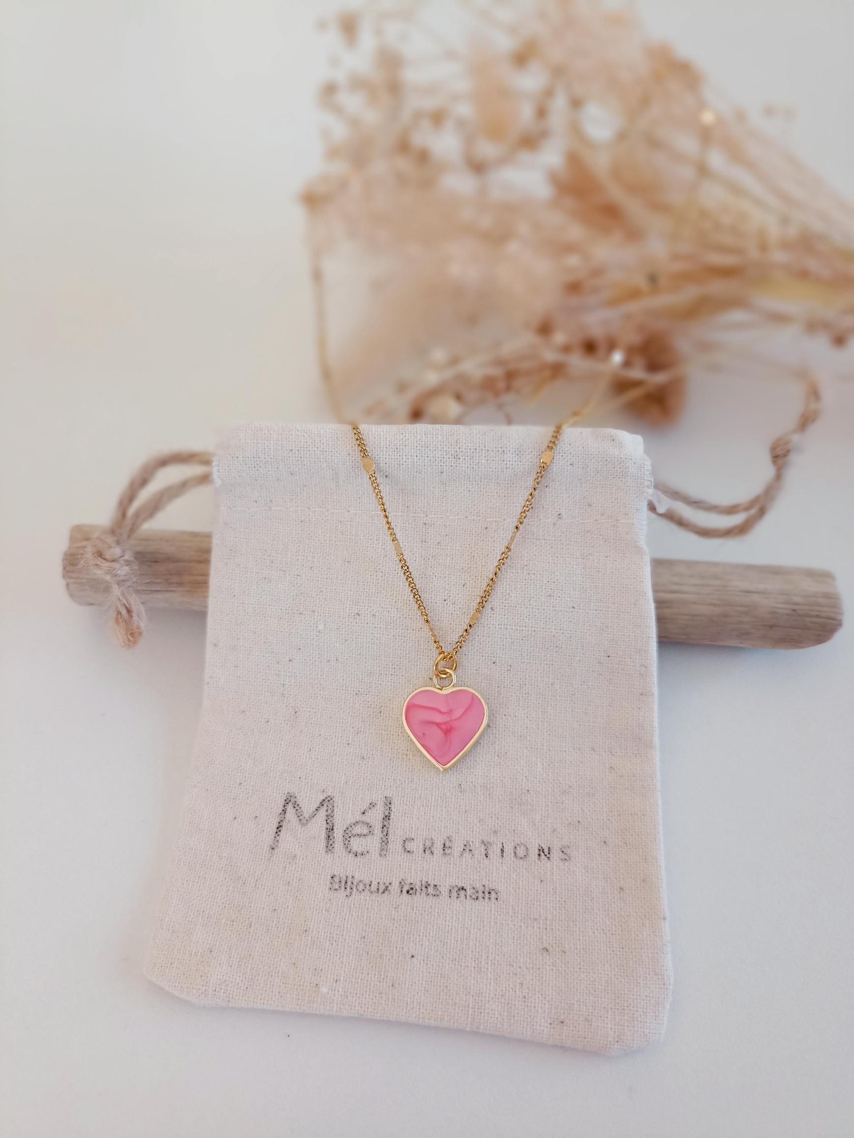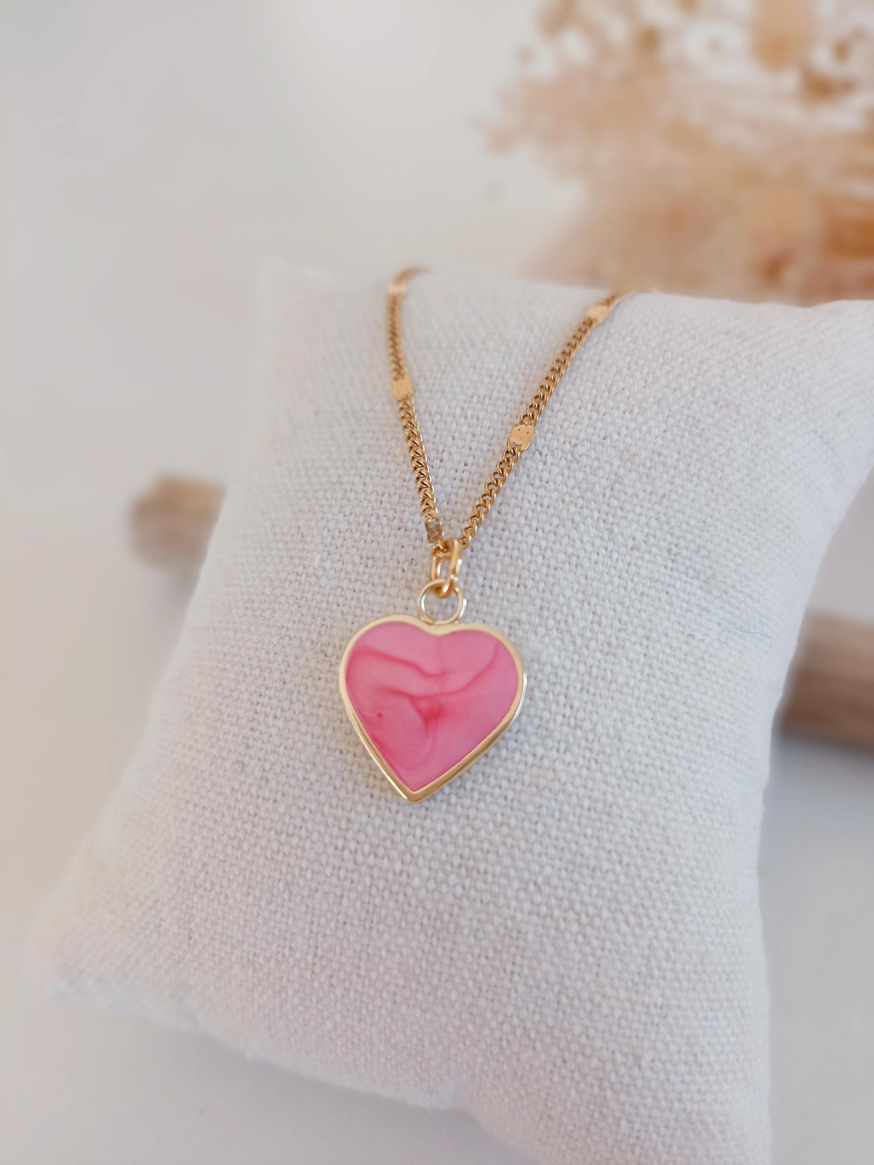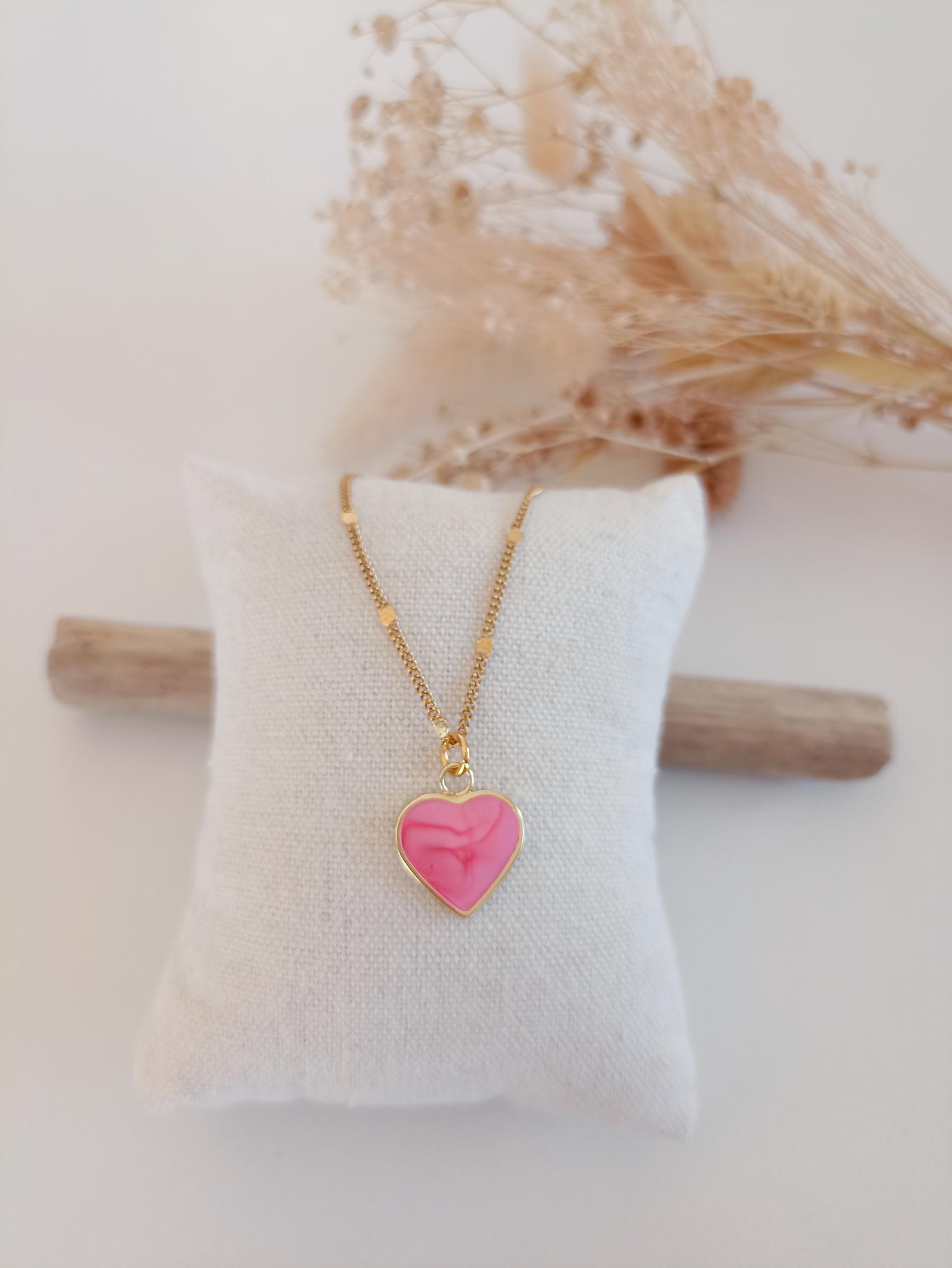 Élégant collier doré agrémenté d’un pendentif délicat cœur rose. Une pièce douce et féminine, parfaite pour apporter une touche de couleur et de charme à votre look.