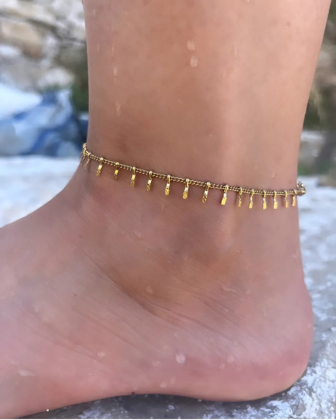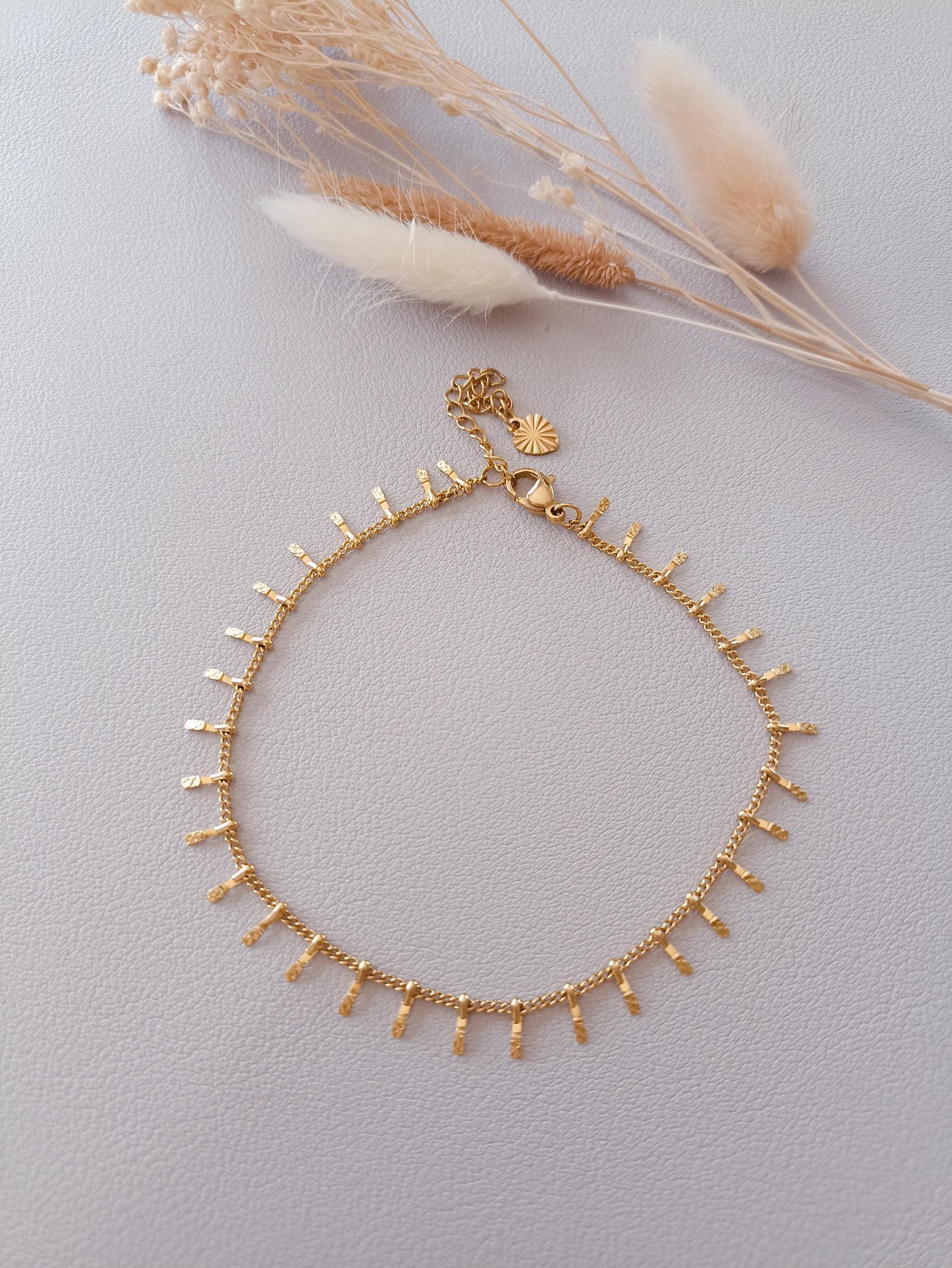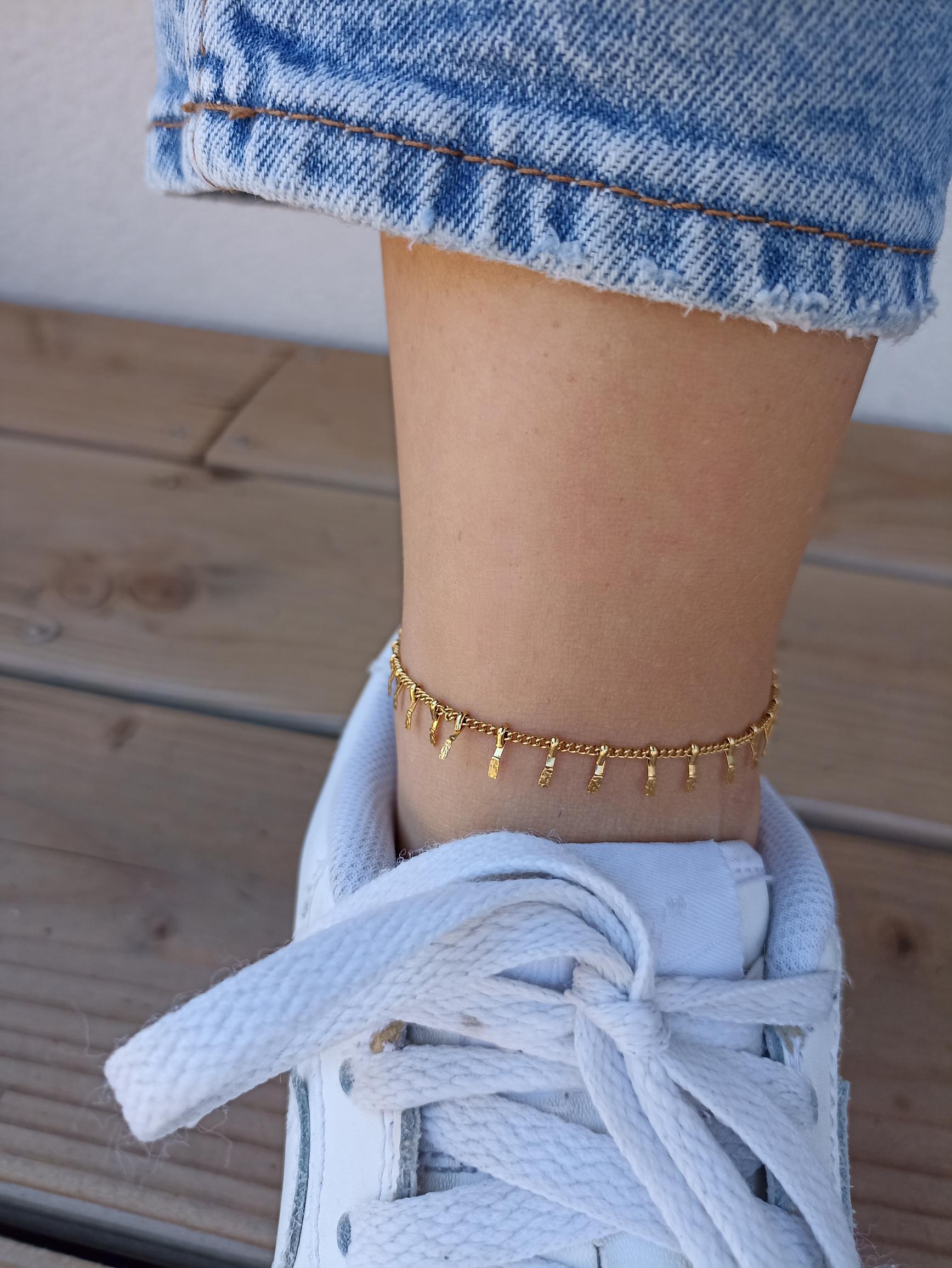 Découvrez Giulia, une chaîne de cheville élégante et résistante, ornée de délicats clous dorés écrasés qui se balancent gracieusement à chaque pas. Portez Giulia et laissez vos chevilles briller sous le soleil d'été.
