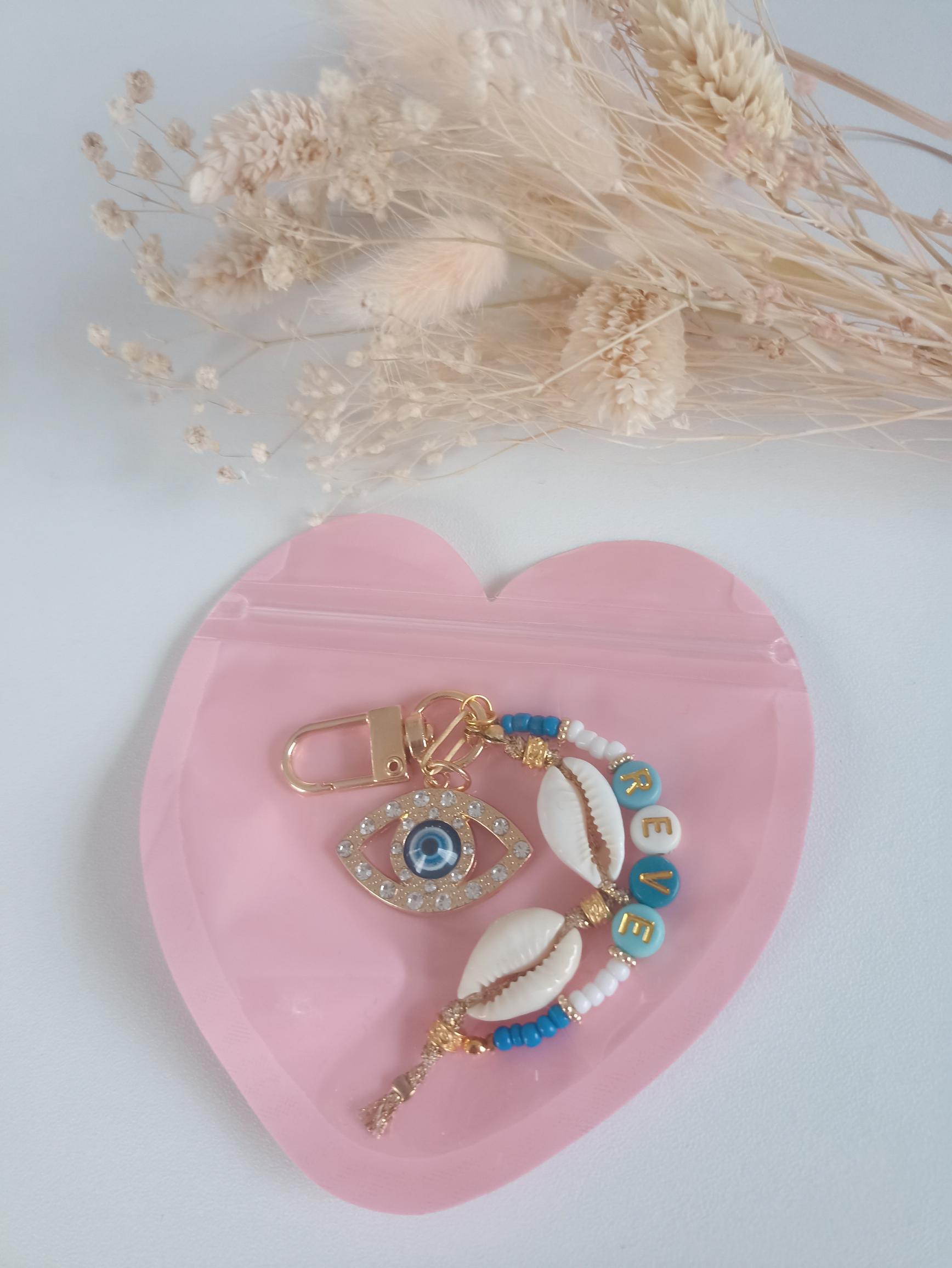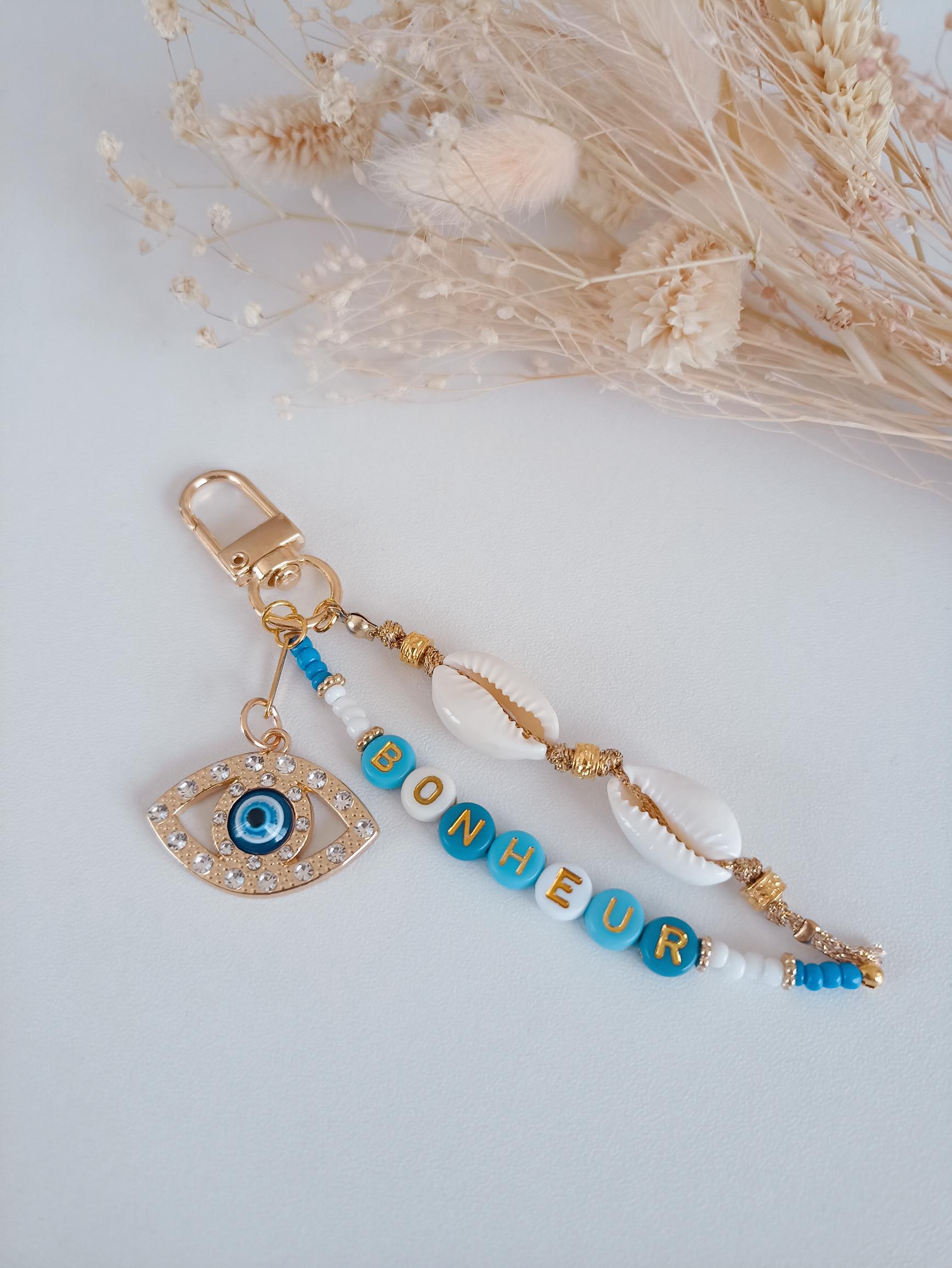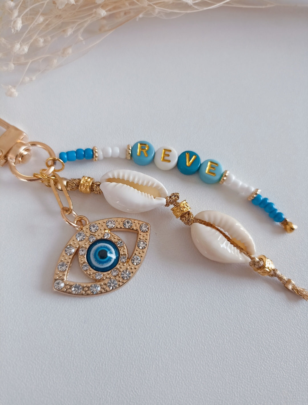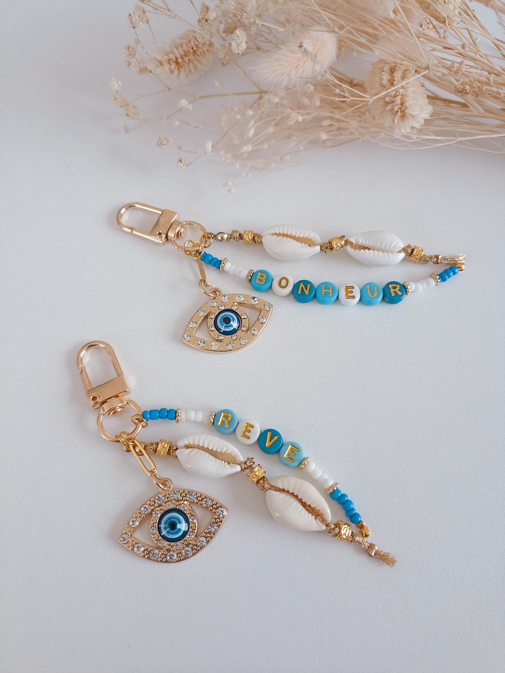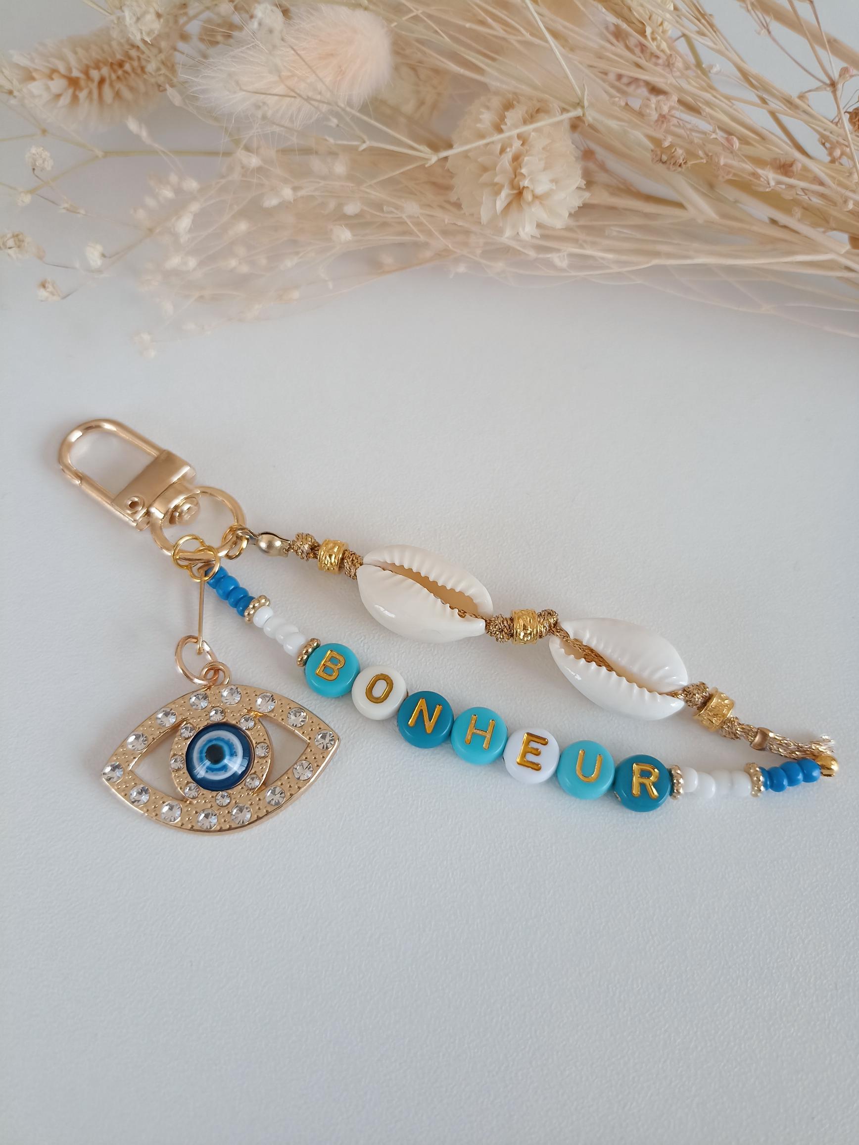 Ajoutez une touche bohème et protectrice à votre quotidien avec ce porte-clés unique. Composé d'une breloque œil protecteur, d'une branche de perles colorées avec un mot significatif et de deux coquillages montés sur un fil doré. Parfait pour un trousseau, un sac ou en cadeau. Il apporte protection, positivité et élégance.