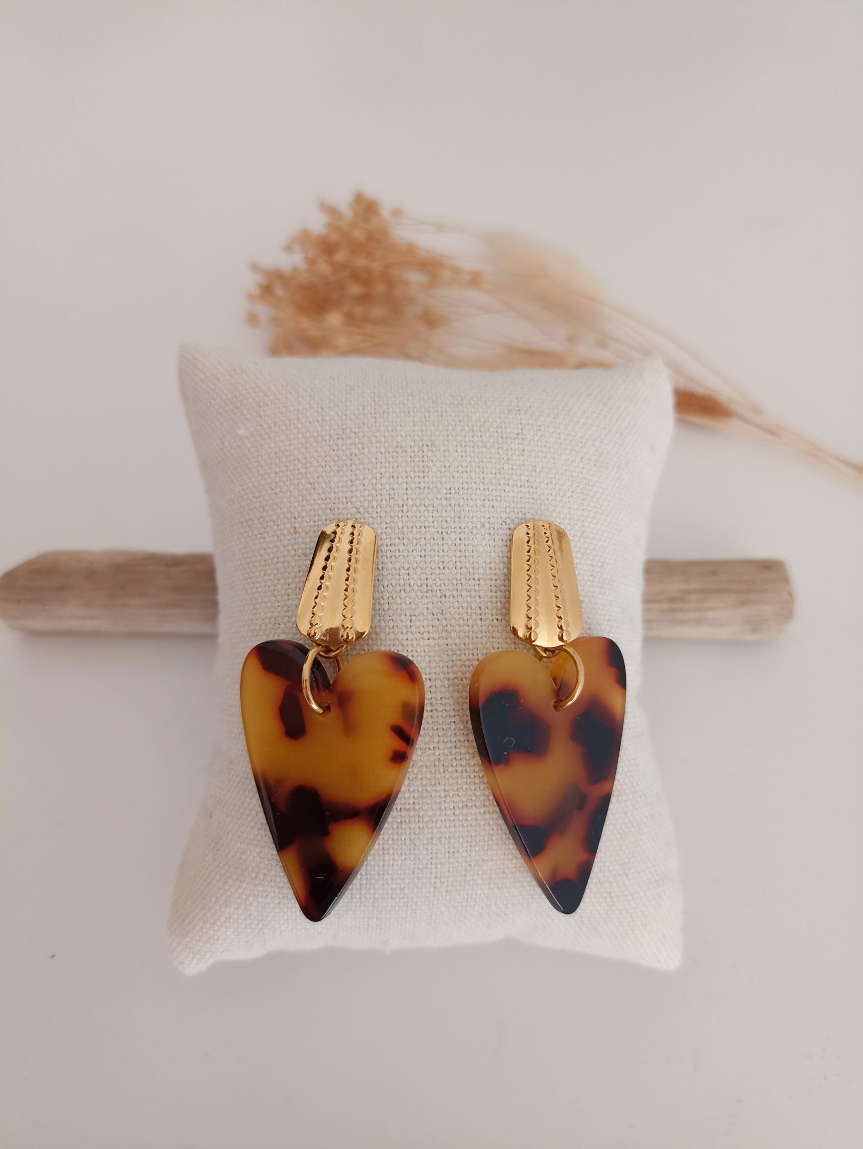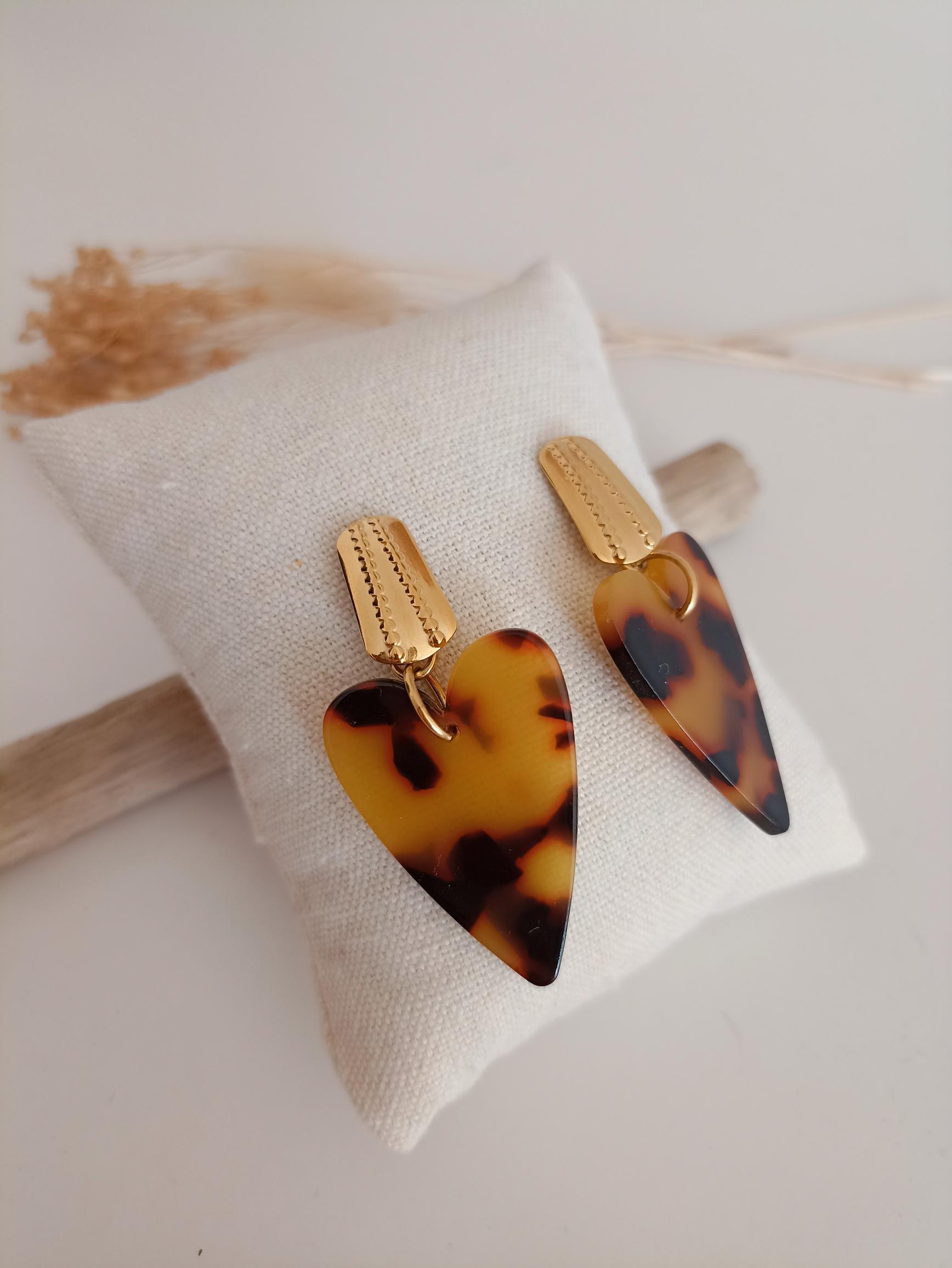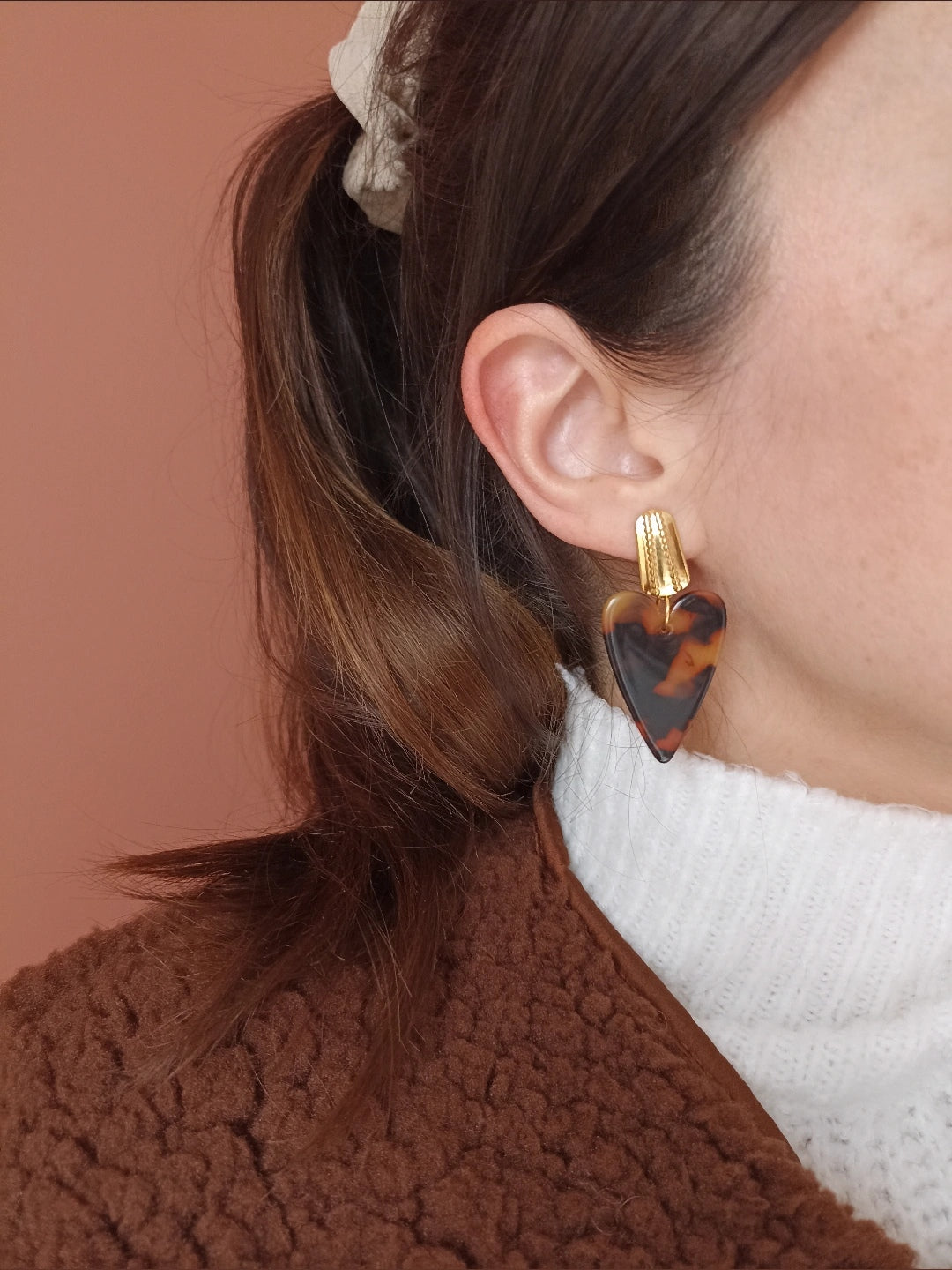 Ajoutez une touche d'élégance à votre look avec ces magnifiques boucles d'oreilles en forme de cœur. Leur design en écaille aux nuances chaudes, combiné à une attache dorée délicatement texturée, apporte un contraste chic et intemporel. Légères et faciles à porter, elles sublimeront toutes vos tenues, des plus décontractées aux plus sophistiquées.