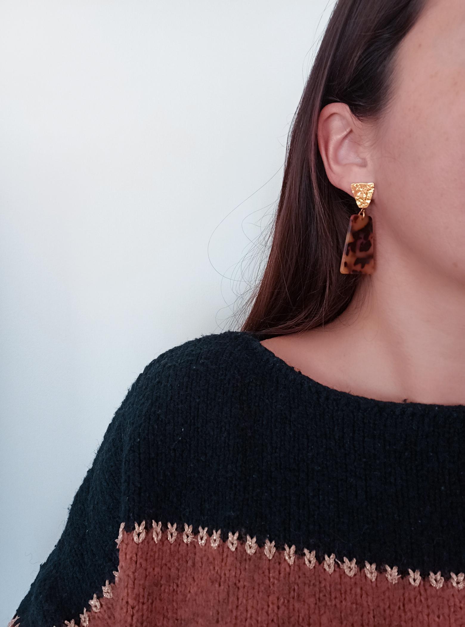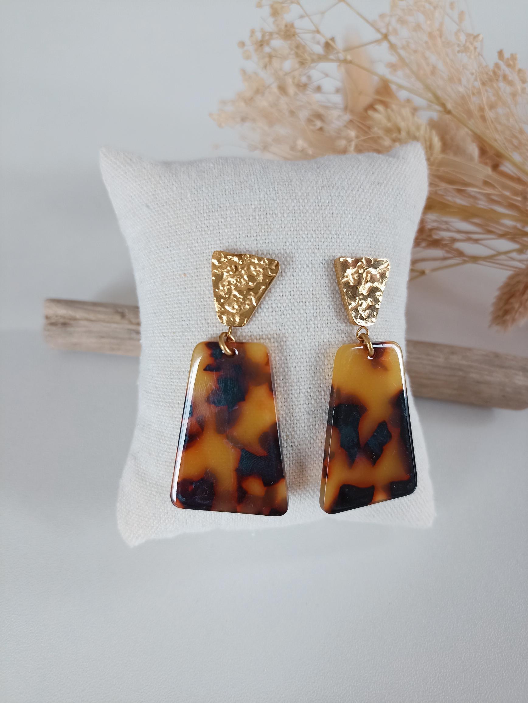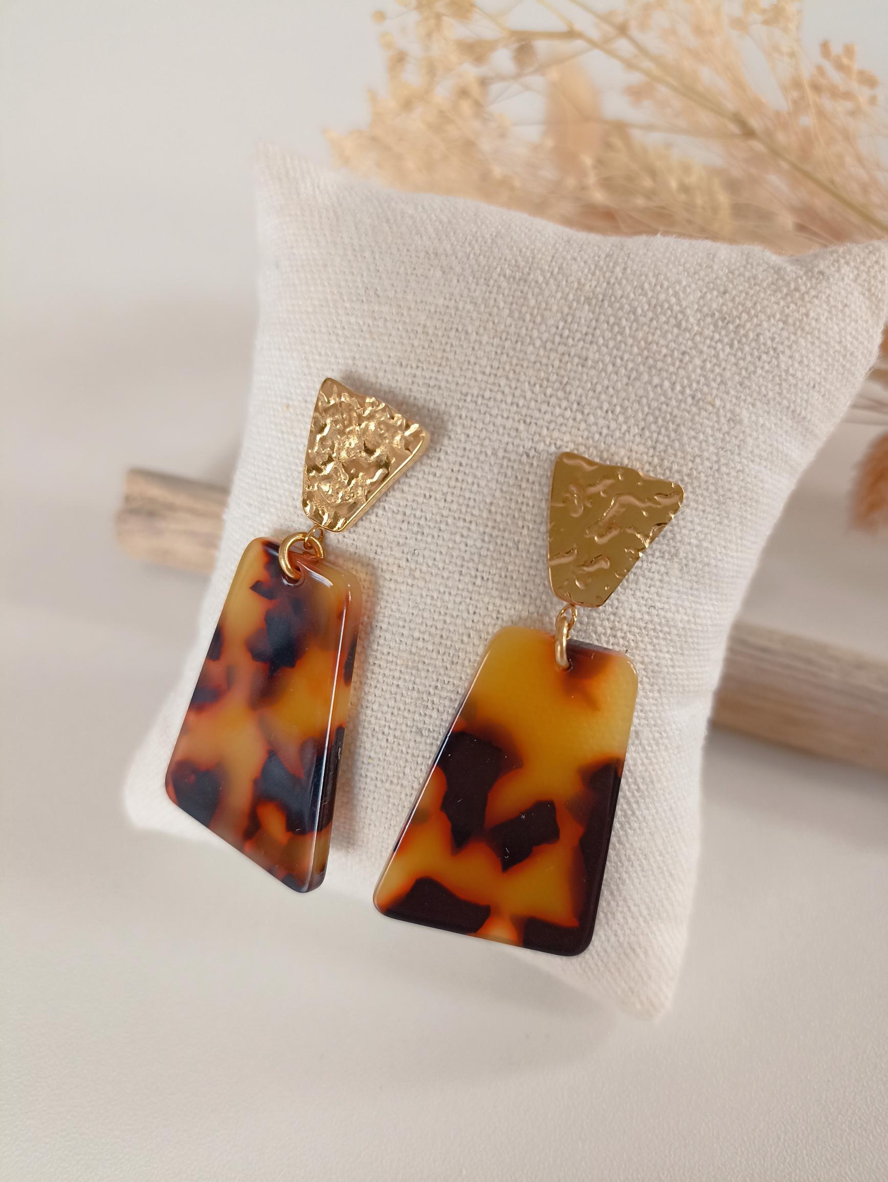 Cette paire de boucles d'oreilles se distingue par un style géométrique. La partie supérieure présente une attache trapèze texturée, apportant un effet martelé sophistiqué. Le pendentif, en forme de trapèze inversé, est réalisé dans un matériau imitant l'écaille de tortue, avec des teintes riches de brun foncé et de jaune-orangé. Parfaits pour un look moderne et élégant.