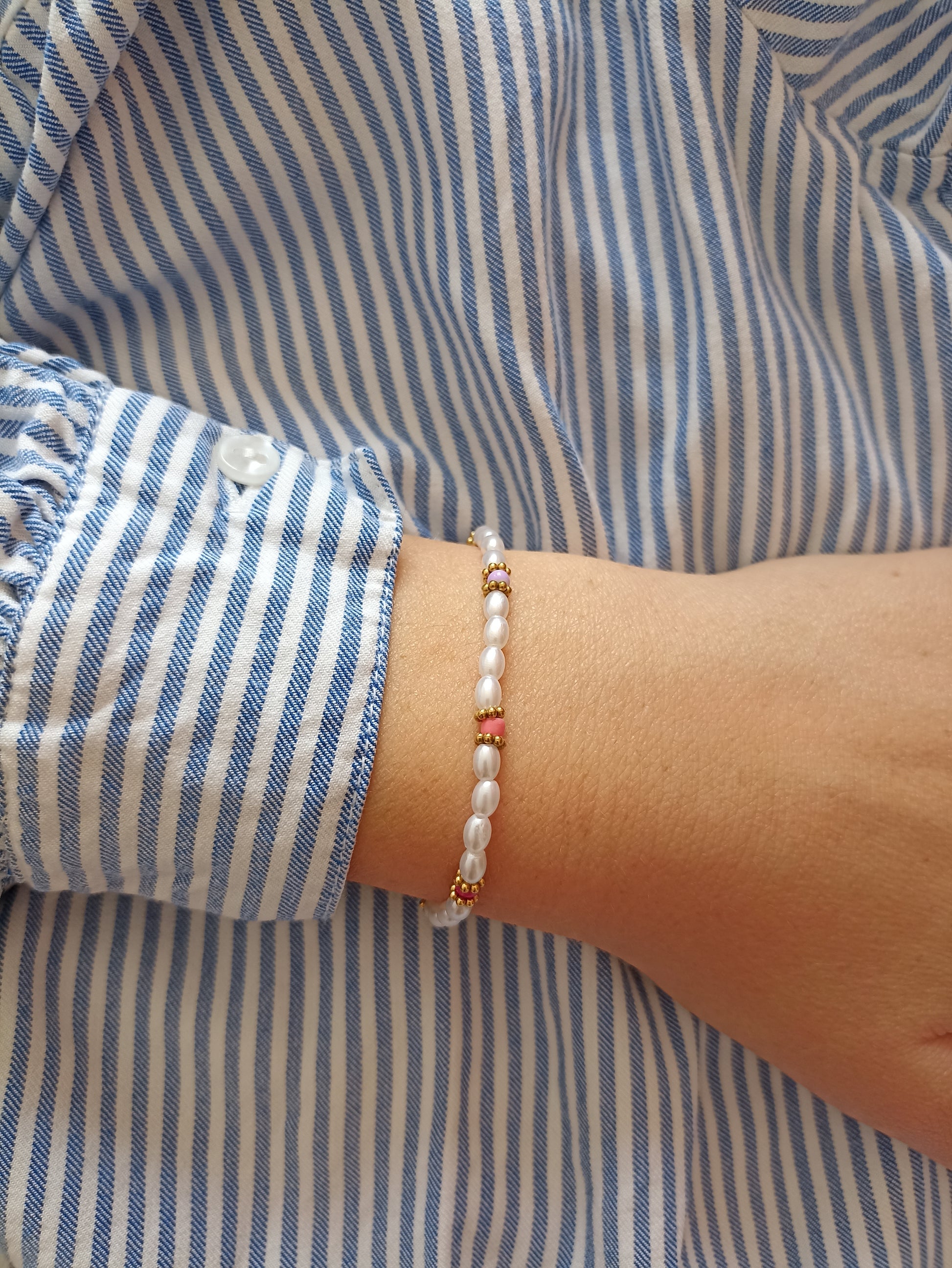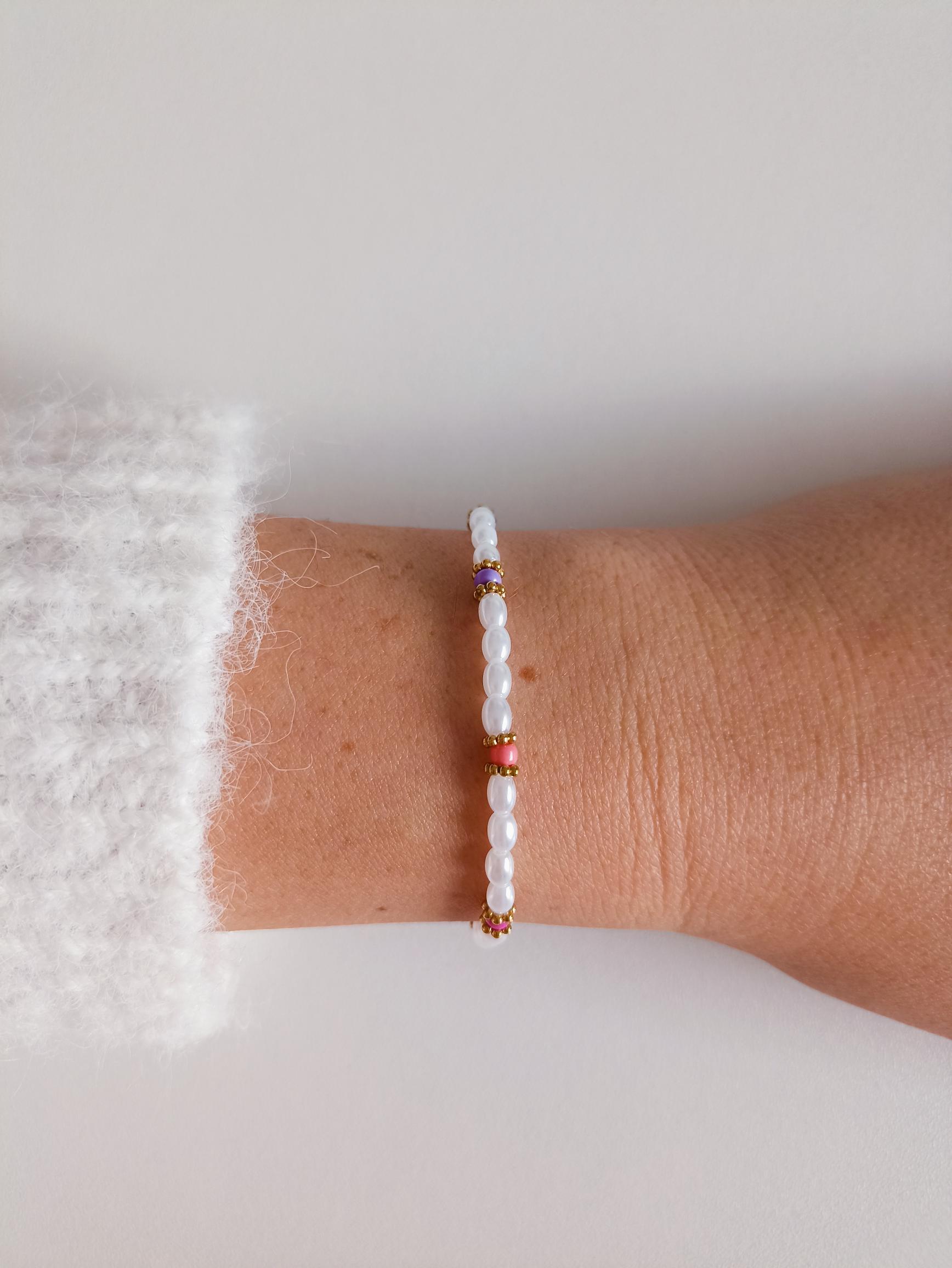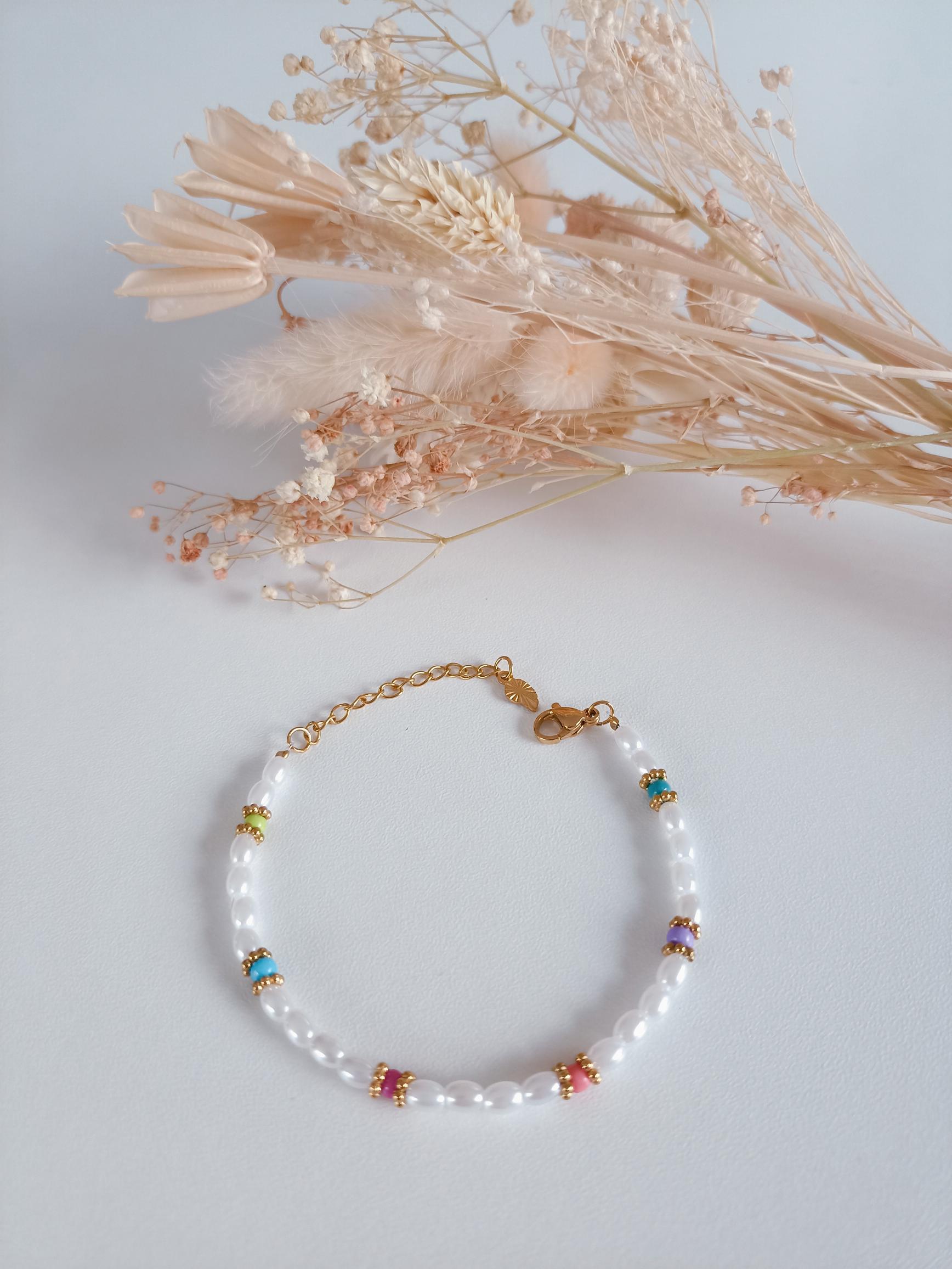 Bracelet raffiné et coloré. Composé d'imitations perles d'eau douce en forme de grain de riz, agrémenté de quelques perles en verre colorées. Fermoir en acier inoxydable pour une durabilité optimale. Ajoutez une touche d'élégance et de couleur à votre tenue avec ce bracelet unique.