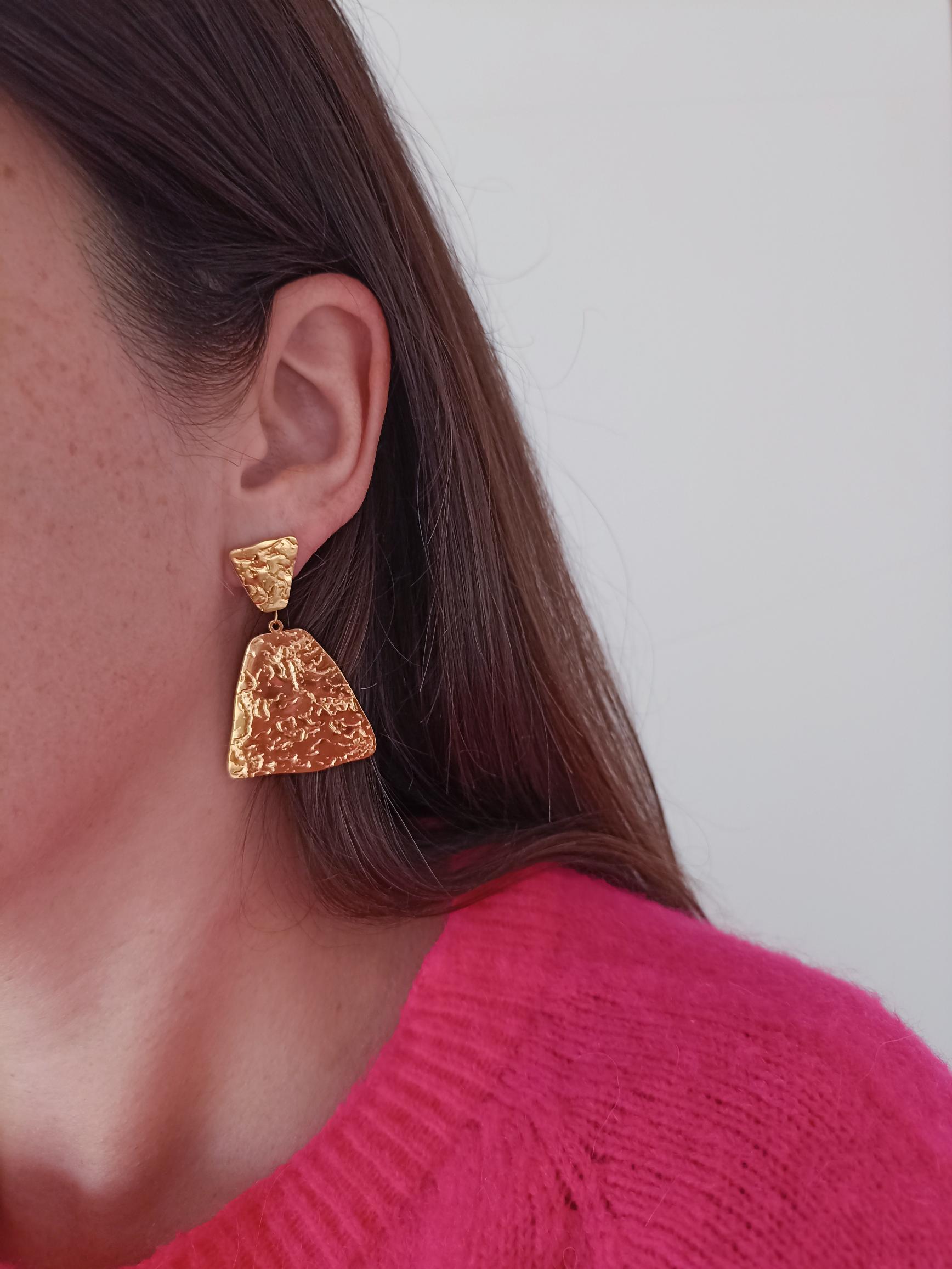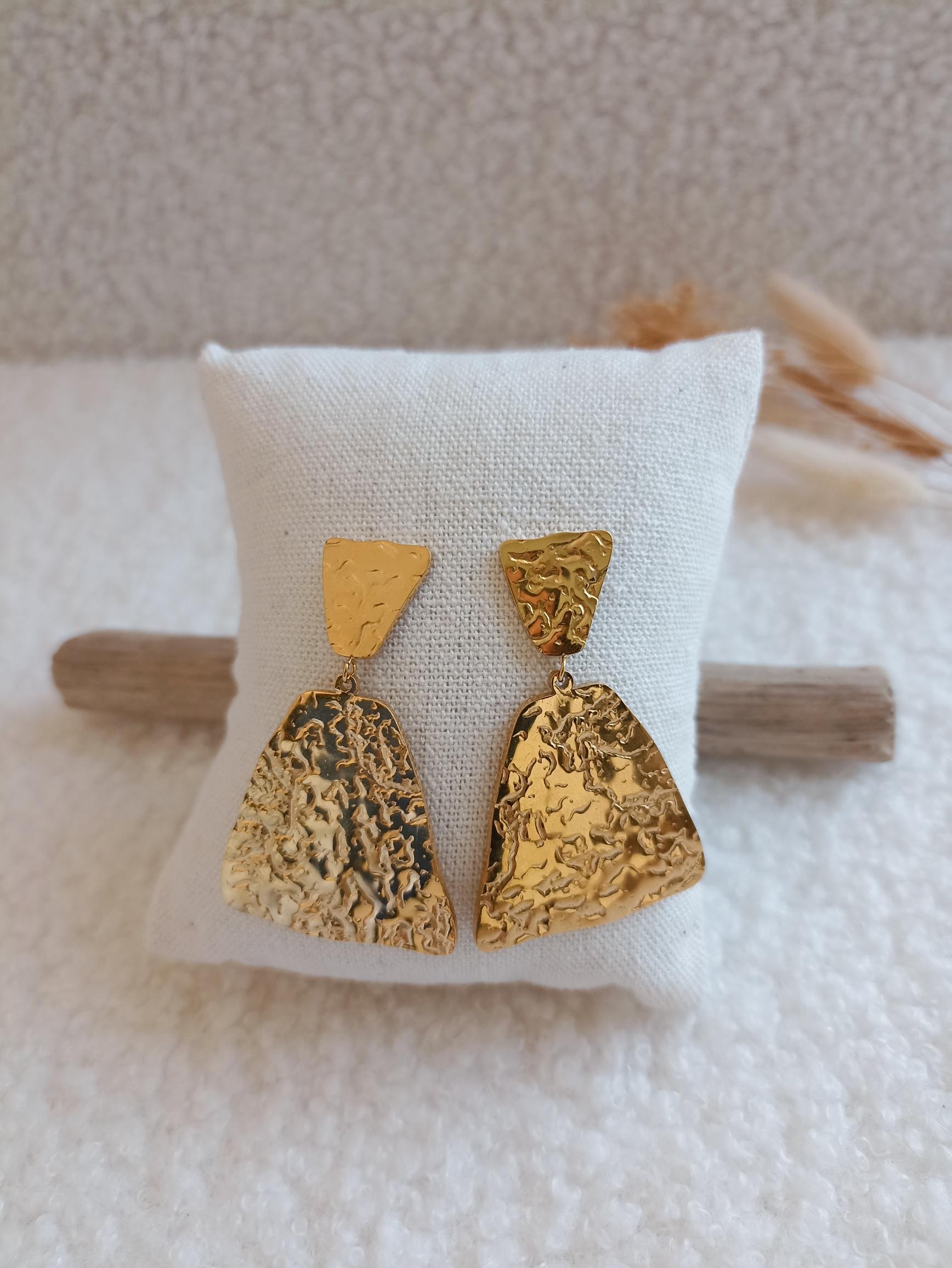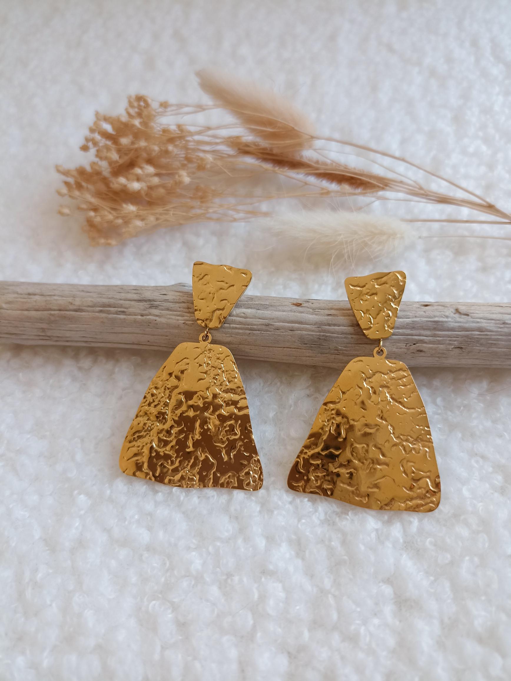 Illuminez votre style avec ces boucles d'oreilles en acier inoxydable doré au design martelé et brillant. Leur surface texturée capte magnifiquement la lumière, sublimant votre visage et mettant en valeur votre cou avec élégance. Un accessoire parfait pour apporter une touche chic et lumineuse à vos tenues, de jour comme de nuit !