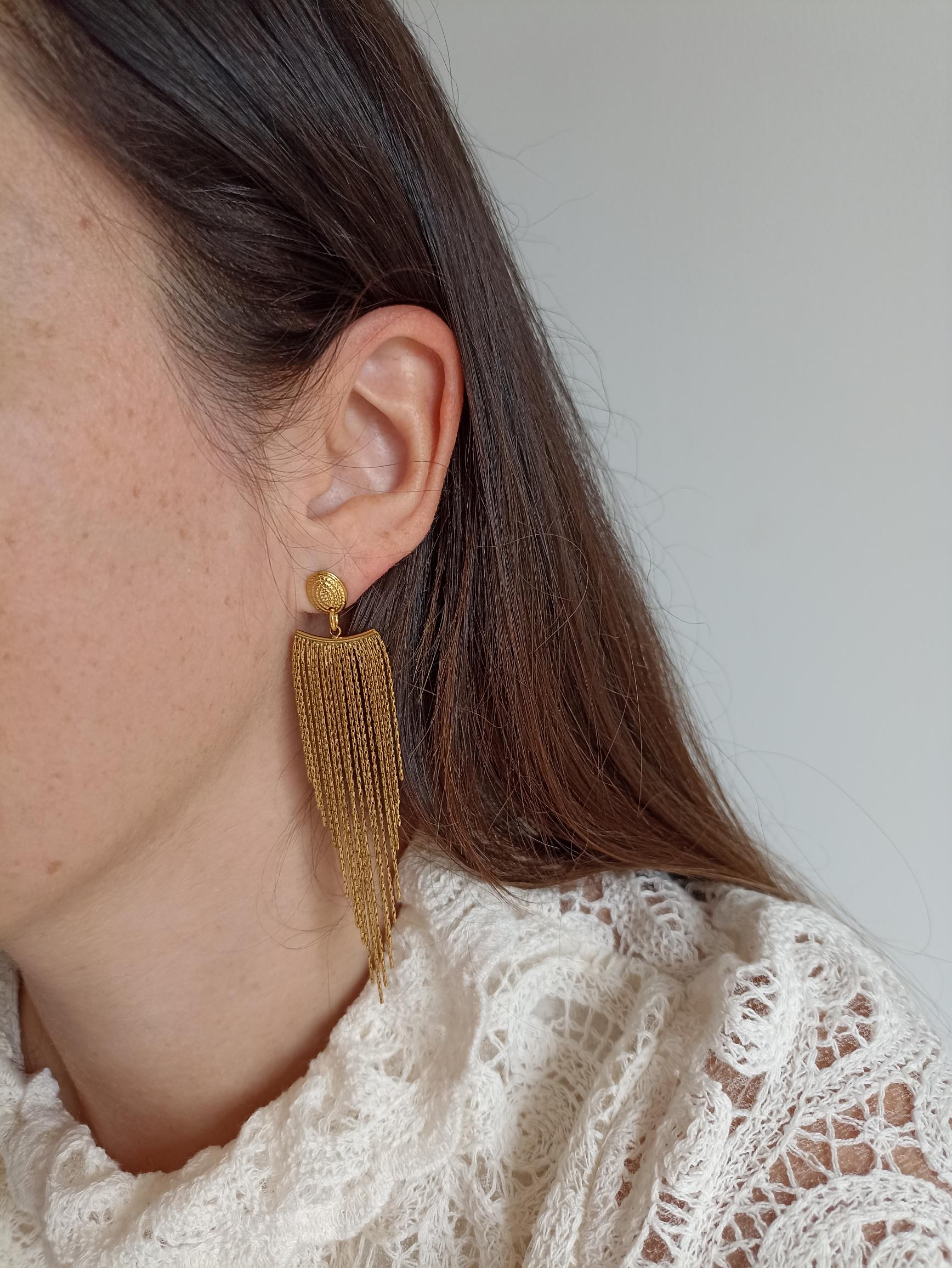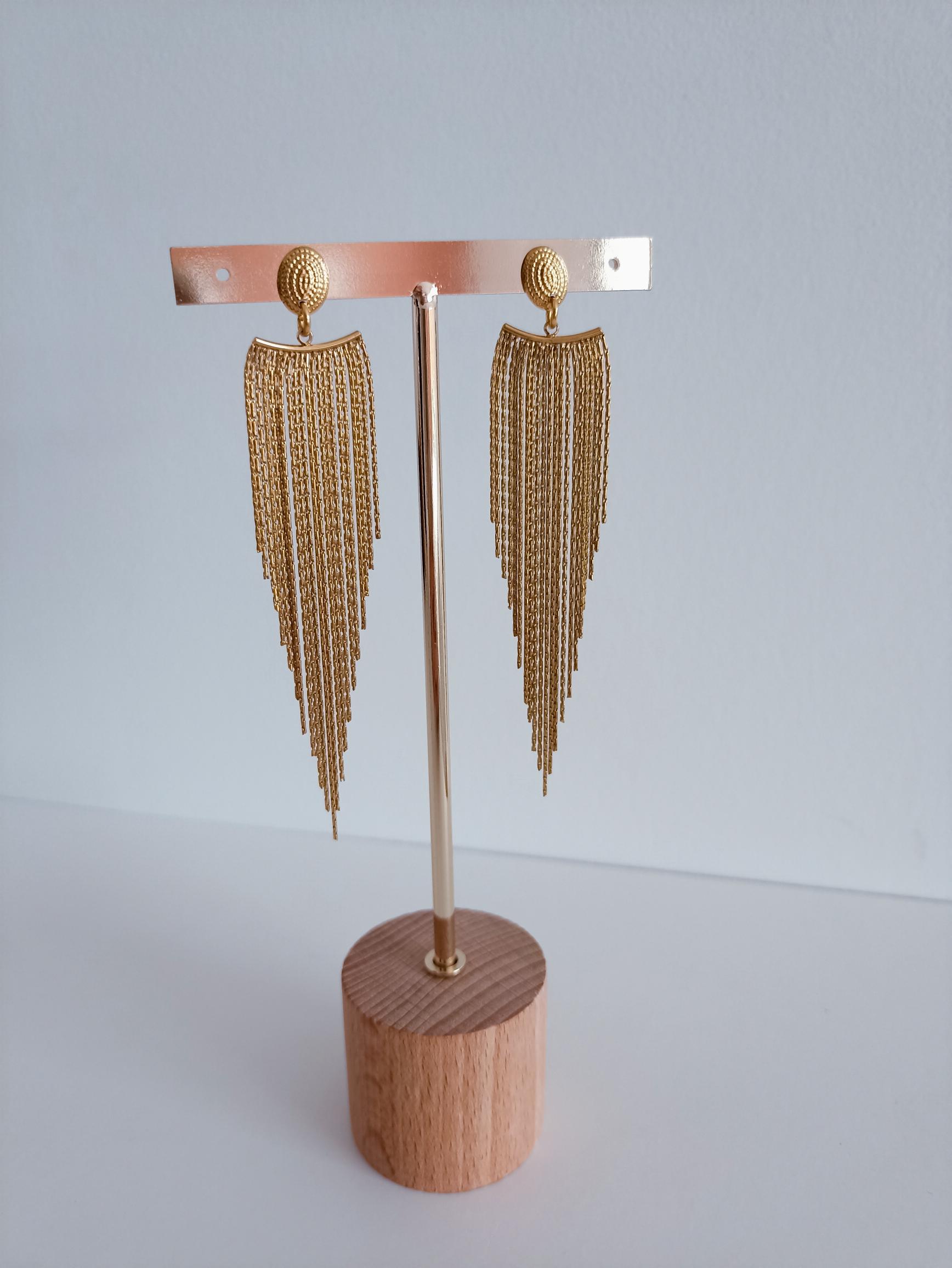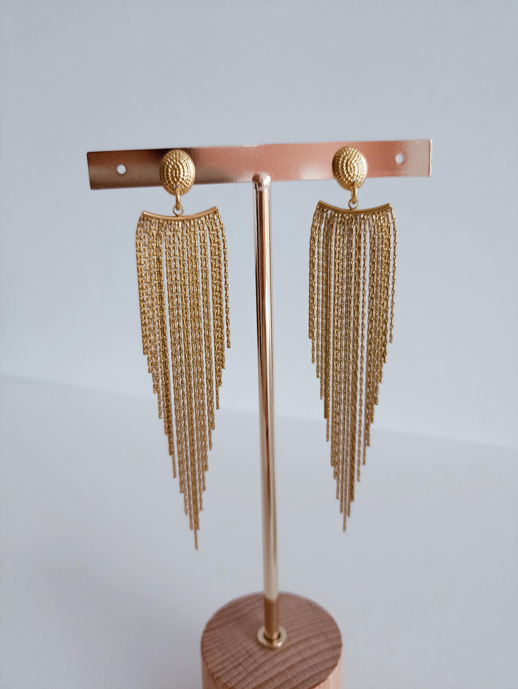 Élégantes et modernes, ces boucles d'oreilles en acier inoxydable doré se distinguent par leurs fines chaînes pendantes, créant un effet cascade raffiné. Leur design aérien et fluide offre une touche de finesse, idéal pour rehausser vos tenues avec élégance.