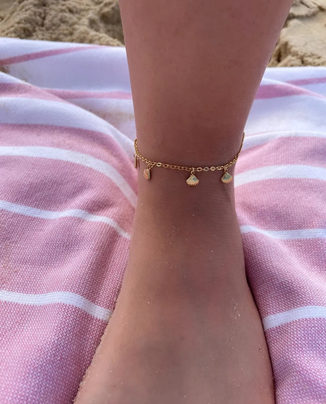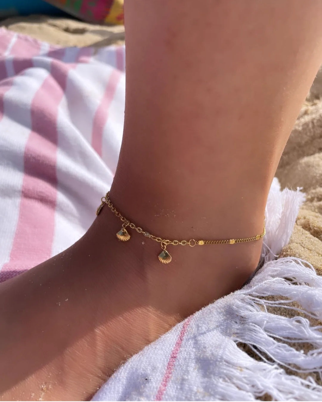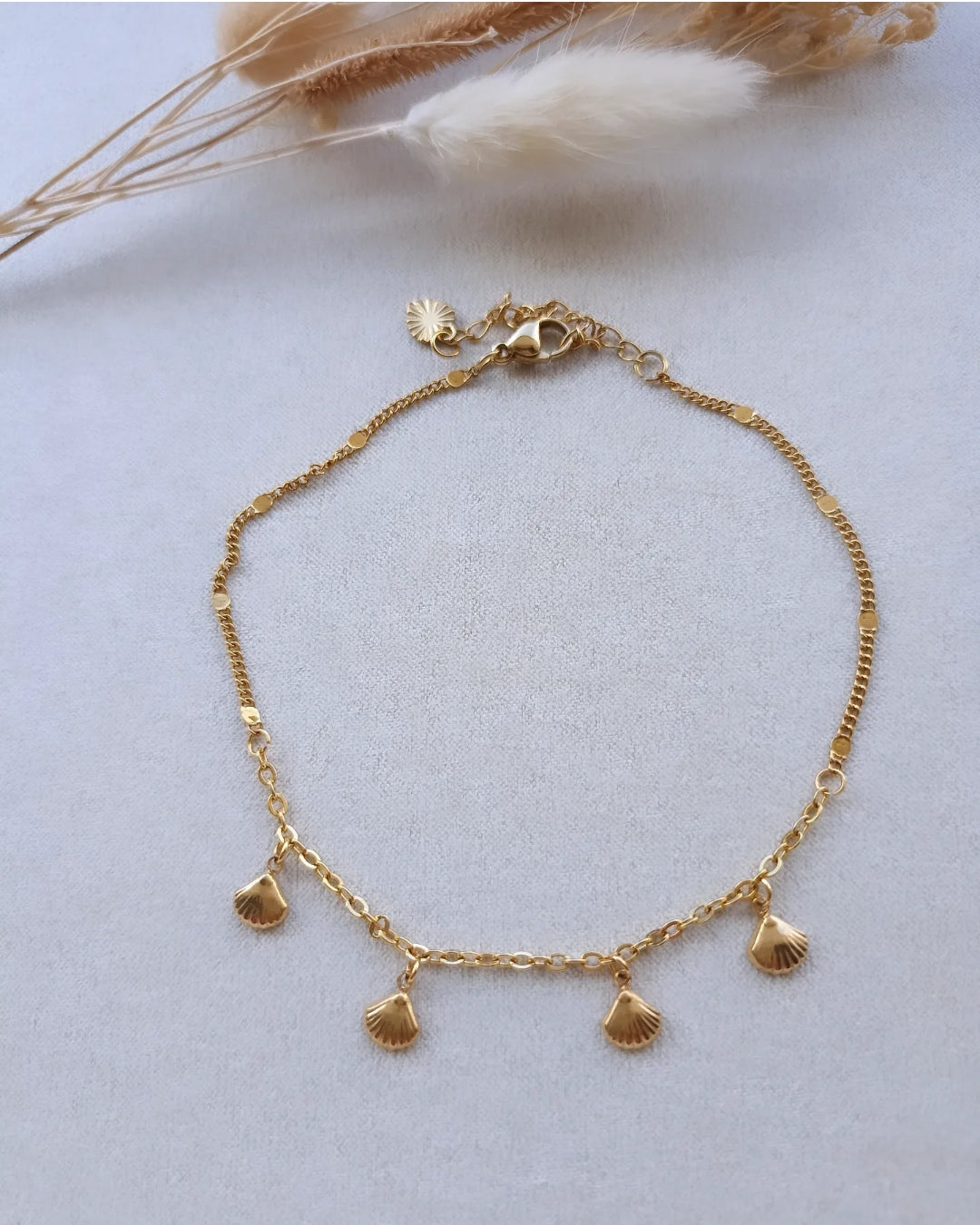 Chaîne de cheville en acier inoxydable ornée de délicates breloques en forme de coquillage. Conçue pour durer, elle résiste à la rouille et au ternissement, idéale pour un usage quotidien ou pour compléter votre tenue de plage.