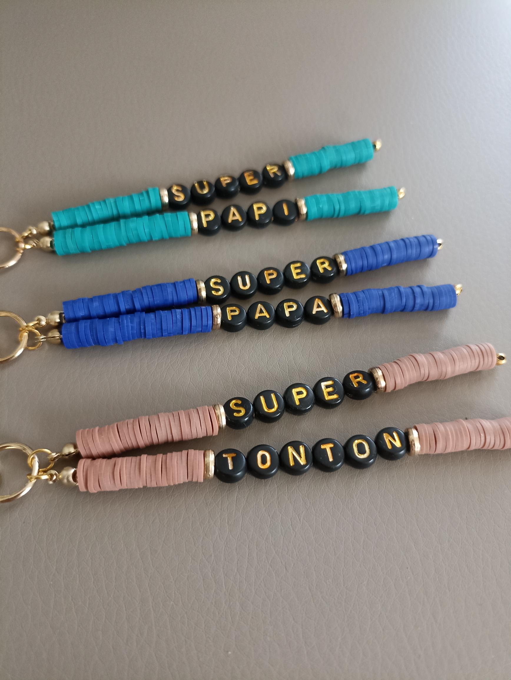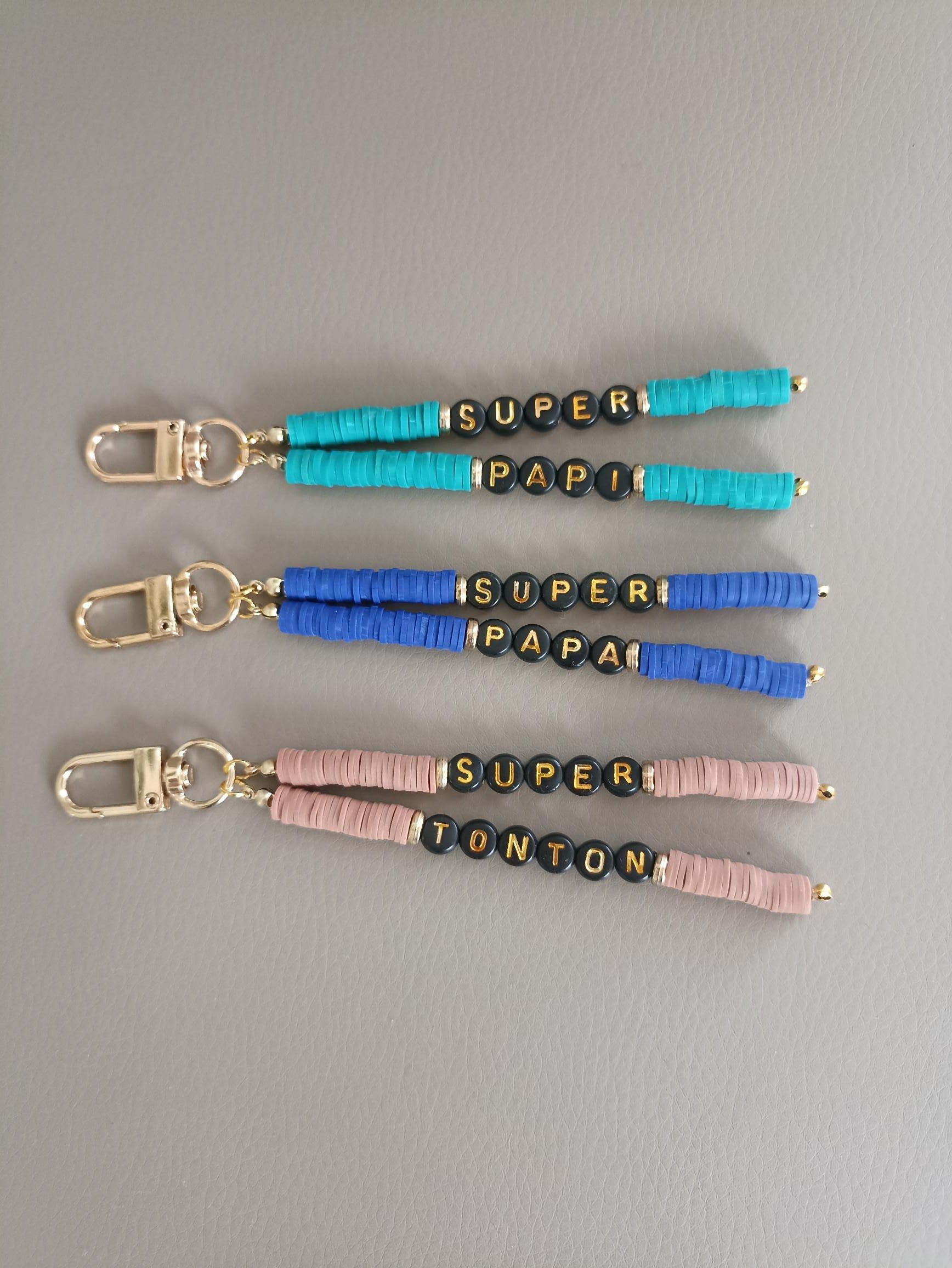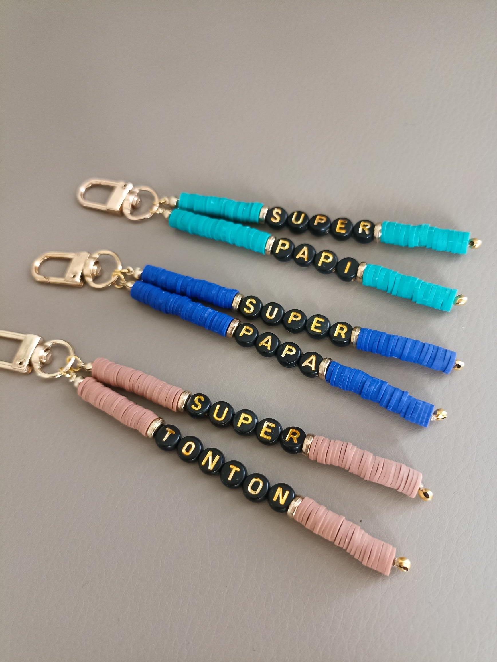 Porte-clés composé de perles heishi avec message sur deux branches, parfait pour ajouter une touche de personnalisation.